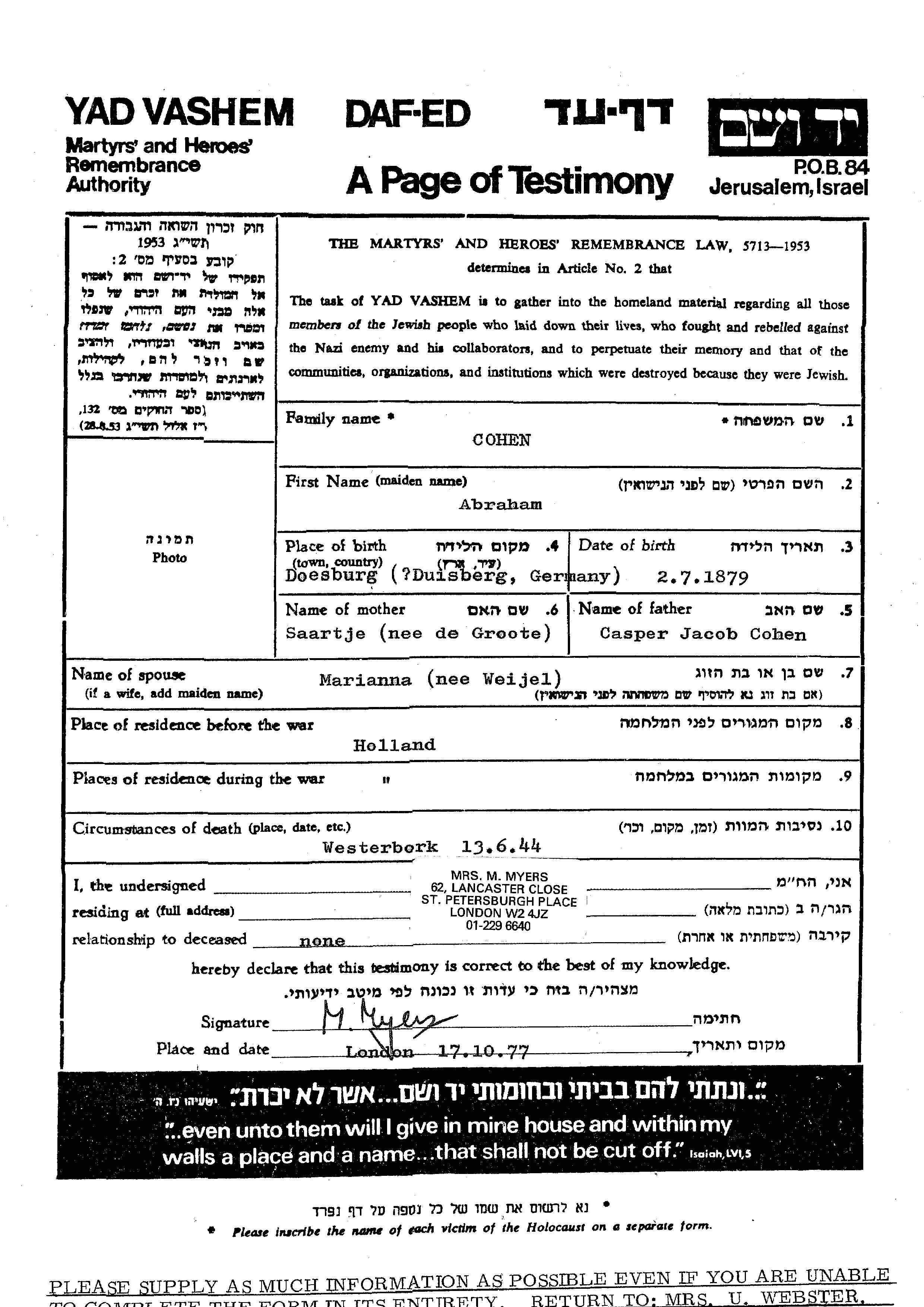 Abraham Cohen est né à Doesburg, Pays-Bas en 1879, fils de Casper Jacob et de Saartje. Il était Mariée à Marianna née Weijel. Avant la seconde guerre mondiale il vivait à Pays-Bas. Au cours de la guerre, il était à Pays-Bas.