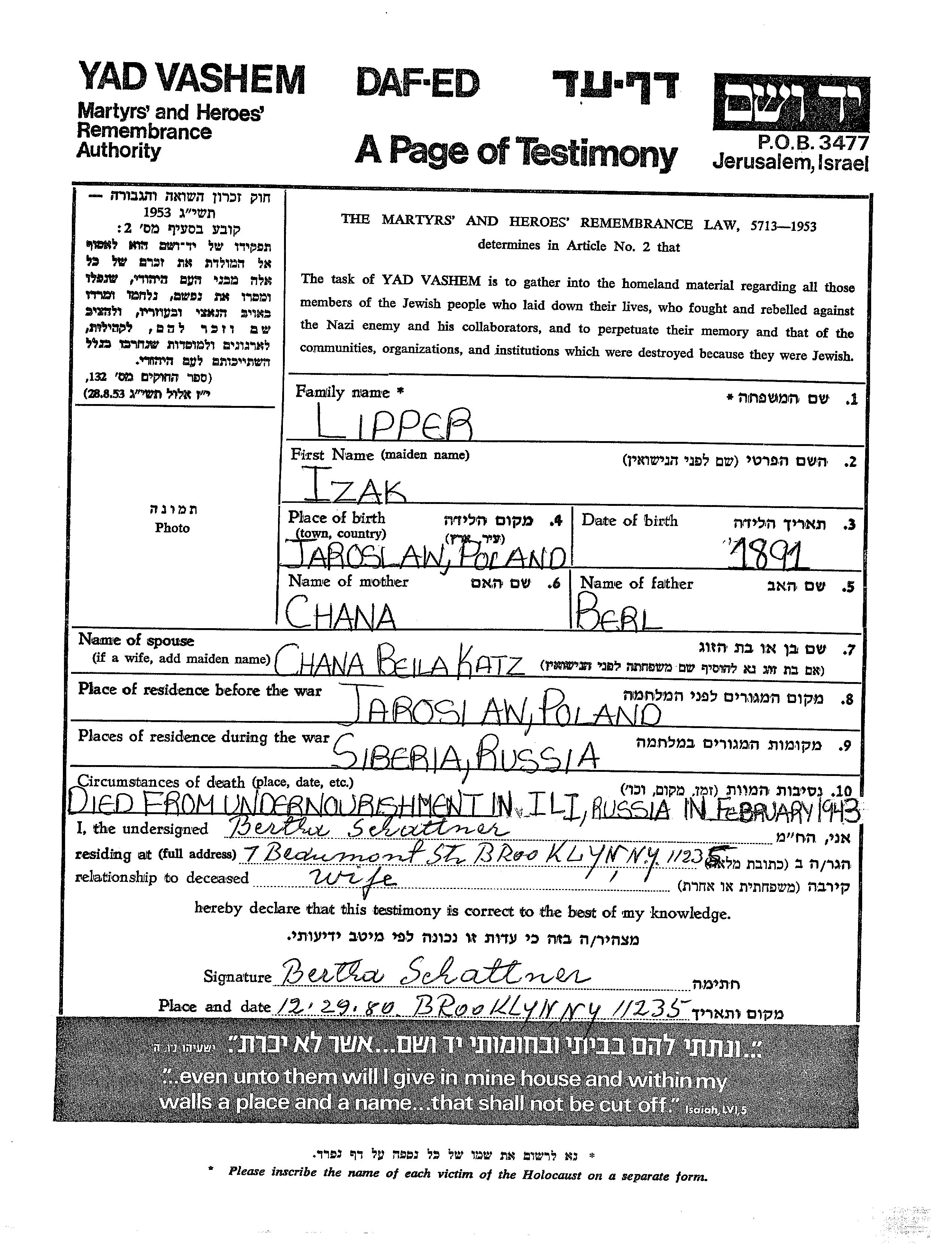 Izak Lipper est né à Jaroslaw, Pologne en 1891, fils de Berl et de Chana. Il était Mariée à Chana Beila née Katz. Avant la seconde guerre mondiale il vivait à Jaroslaw, Pologne. Au cours de la guerre, il était à Siberia Region, Russie (URSS).