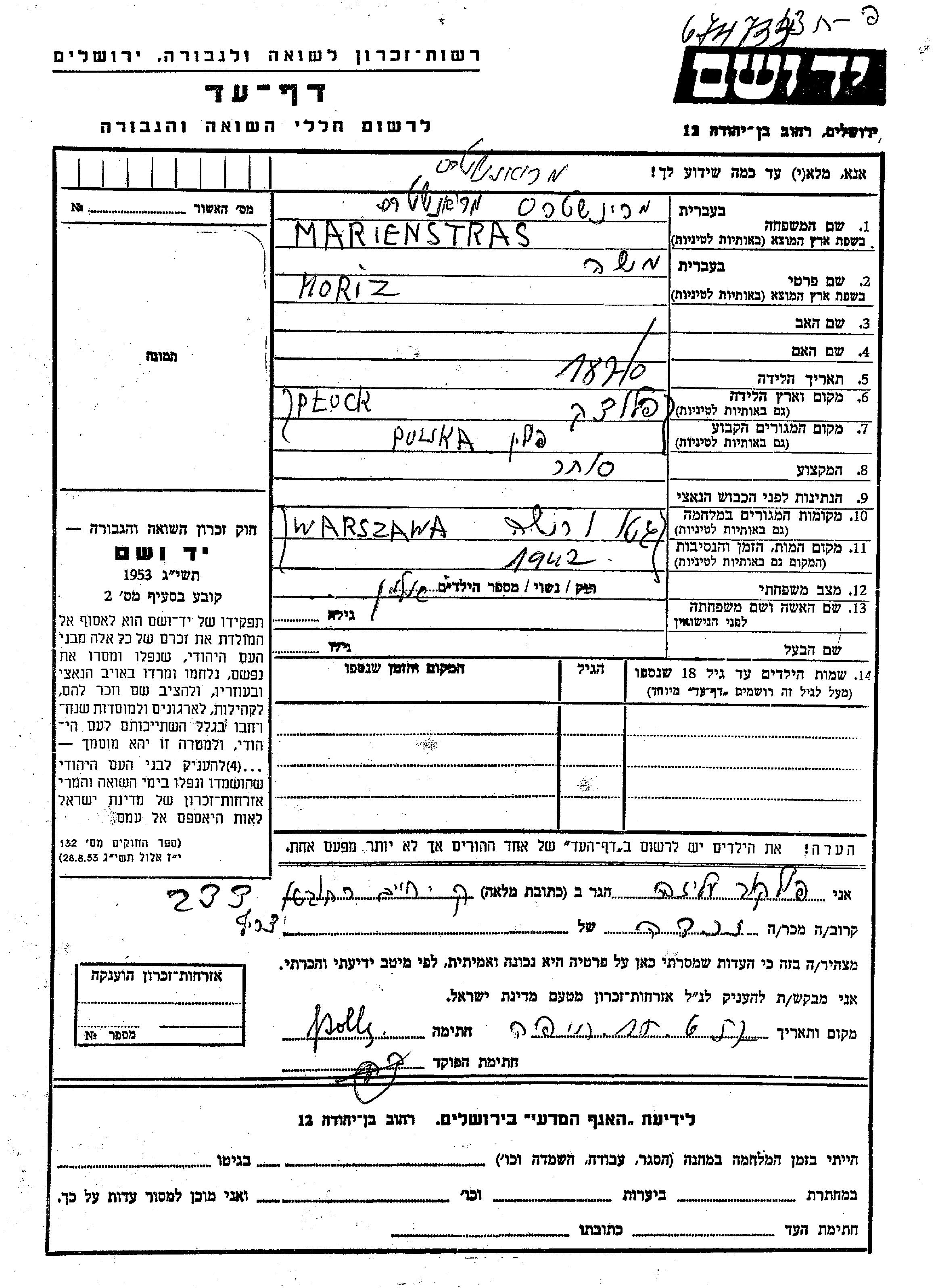Moriz Moshe Marienstras est né à Plock, Pologne en 1870. Il était Commerçant/e et veuf. Avant la seconde guerre mondiale il vivait à Plock, Pologne. Au cours de la guerre, il était à Warsaw, Pologne.
