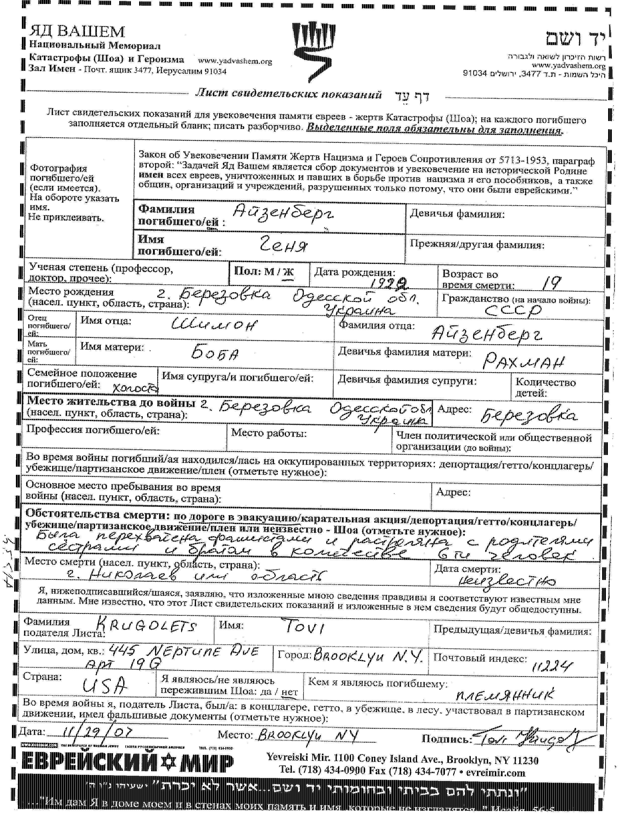 Aizenberg Genya 1922 Berezovka, Ukraine (URSS) Feuille de témoignage