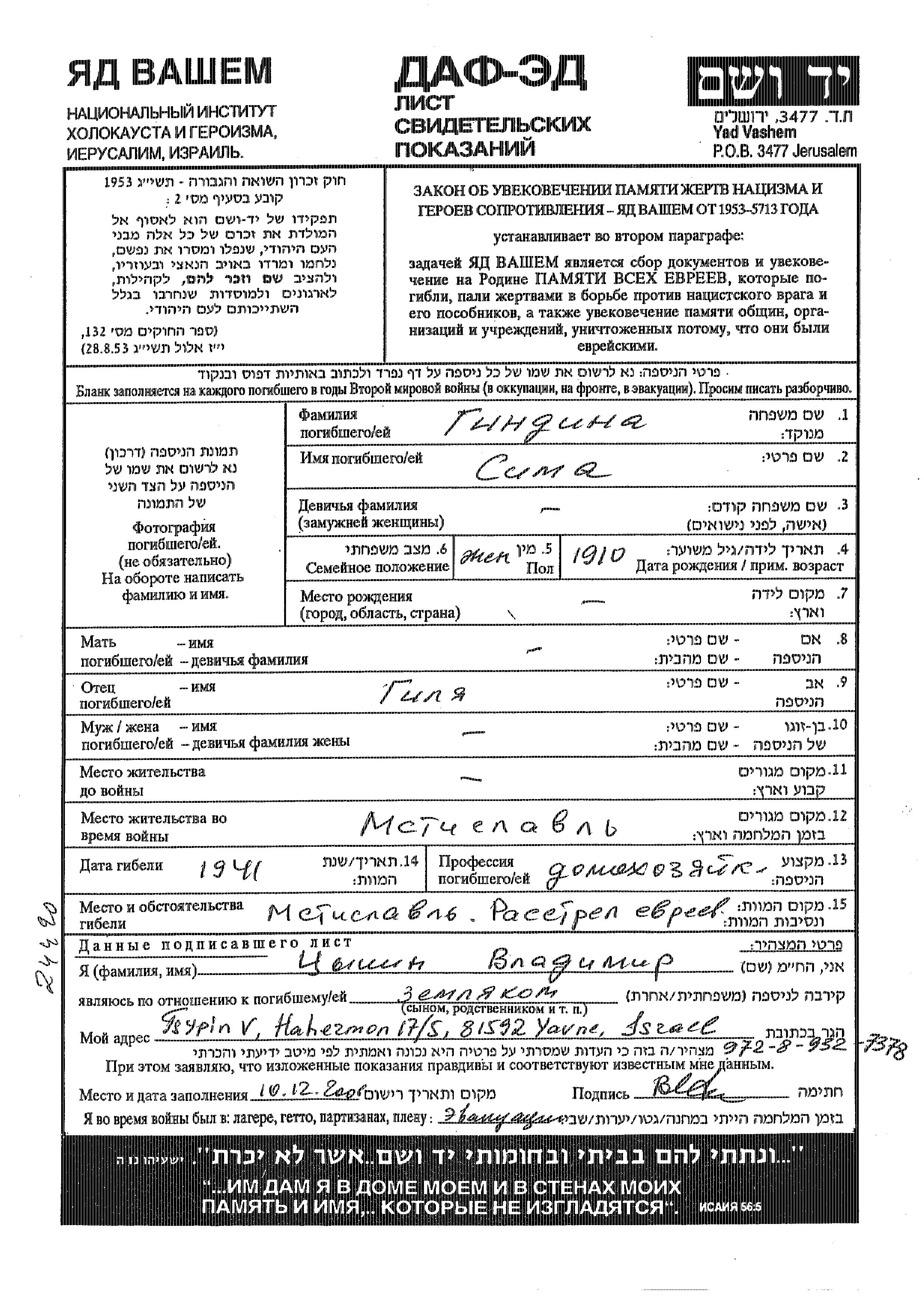 Yad Vashem - Pages of Testimony Names Memorial Collection