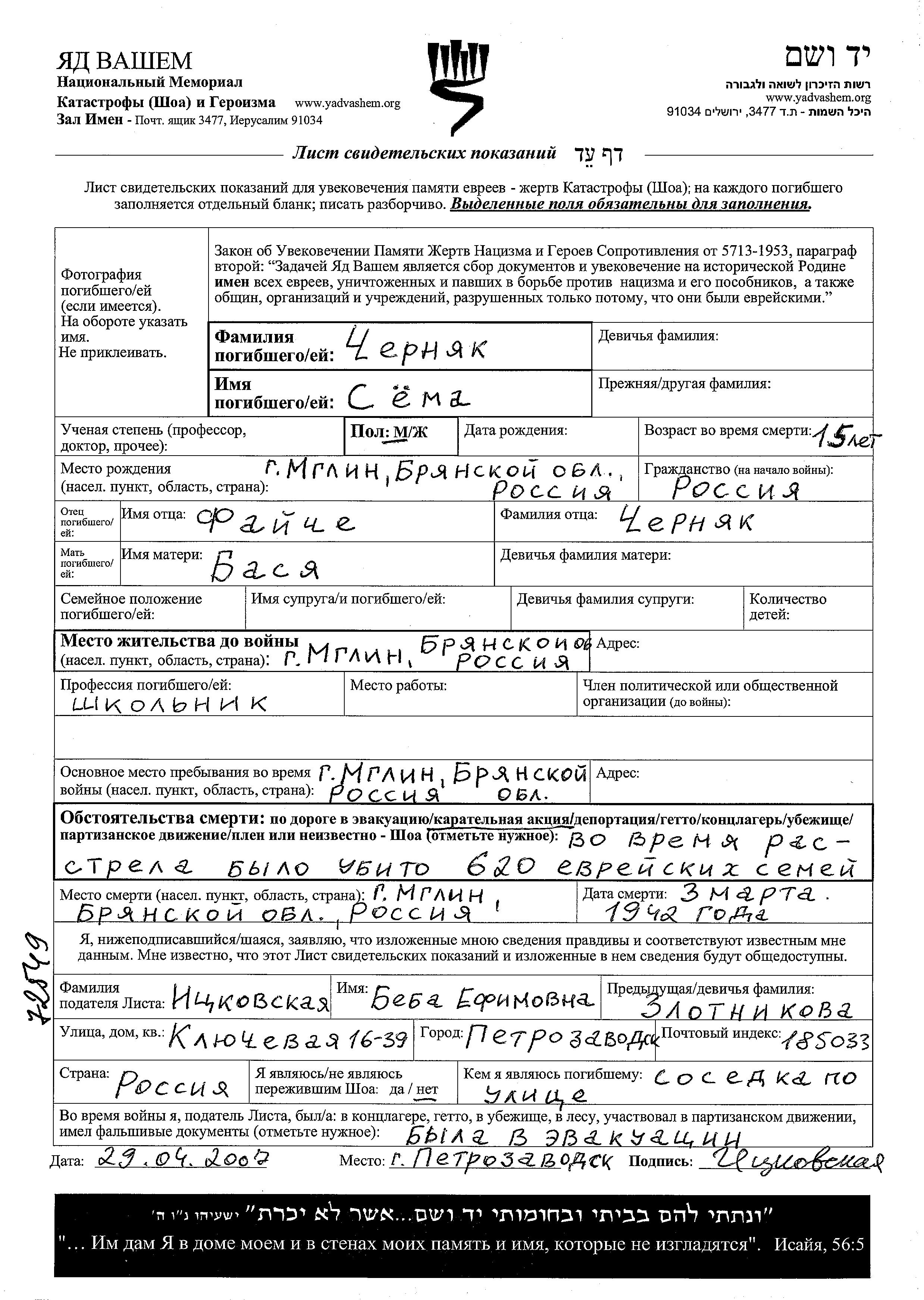 Chernyak Syoma Mglin, Russie (URSS) Feuille de témoignage