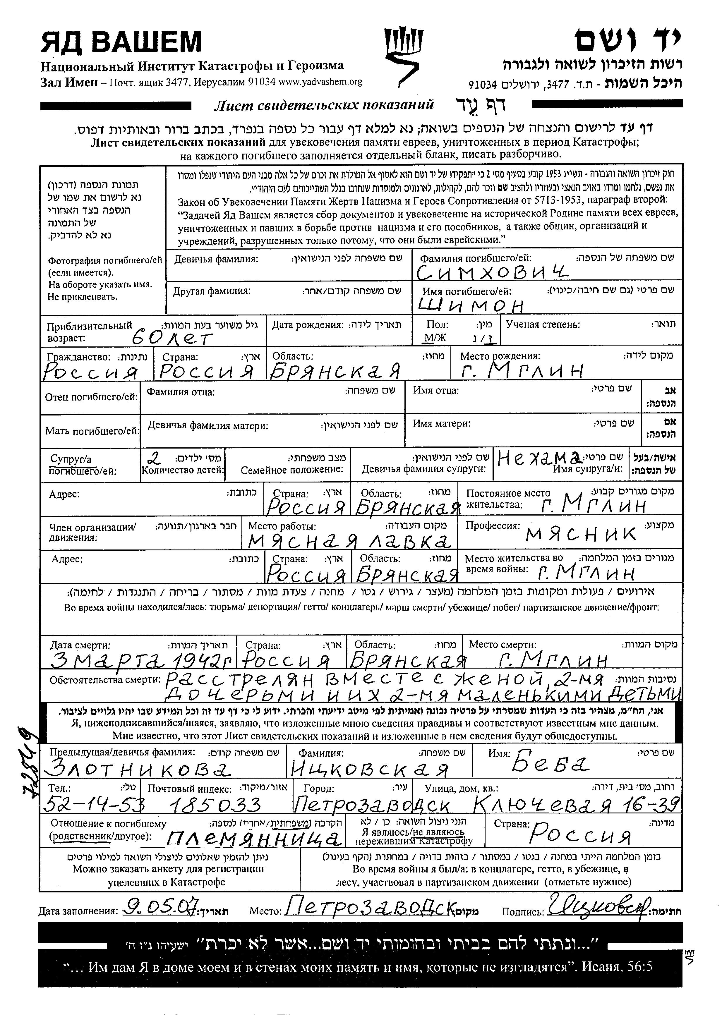Shimon Simkhovich est né à Mglin, Russie (URSS). Il était Boucher et Mariée à Nekhama. Avant la seconde guerre mondiale il vivait à Mglin, Russie (URSS). Au cours de la guerre, il était à Mglin, Russie (URSS).