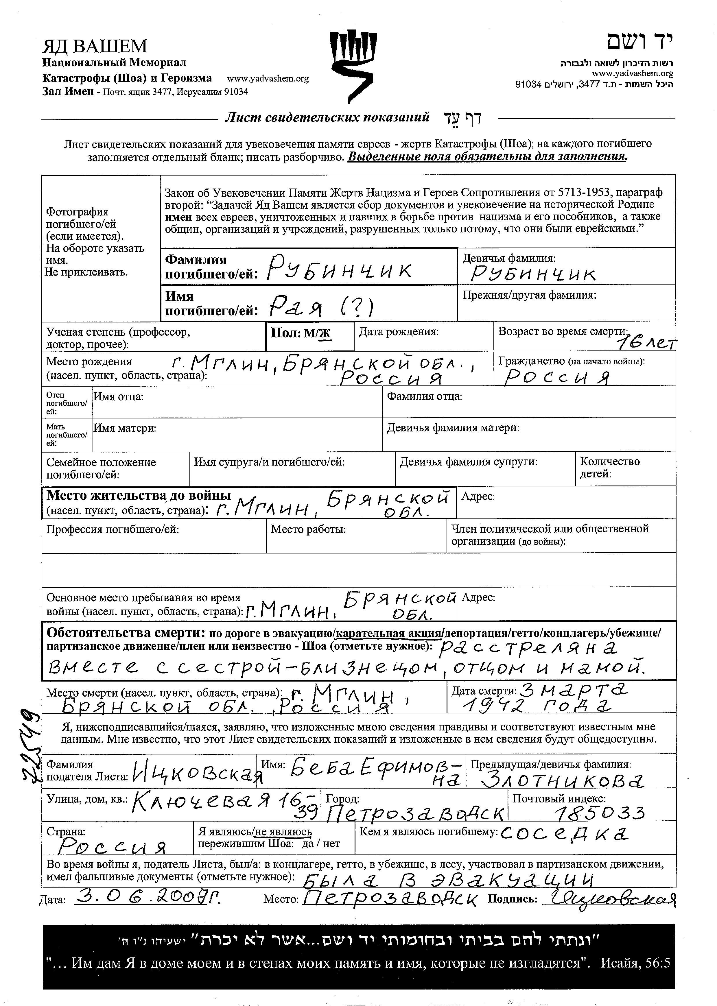 Rubinchik Raya Mglin, Russie (URSS) Feuille de témoignage