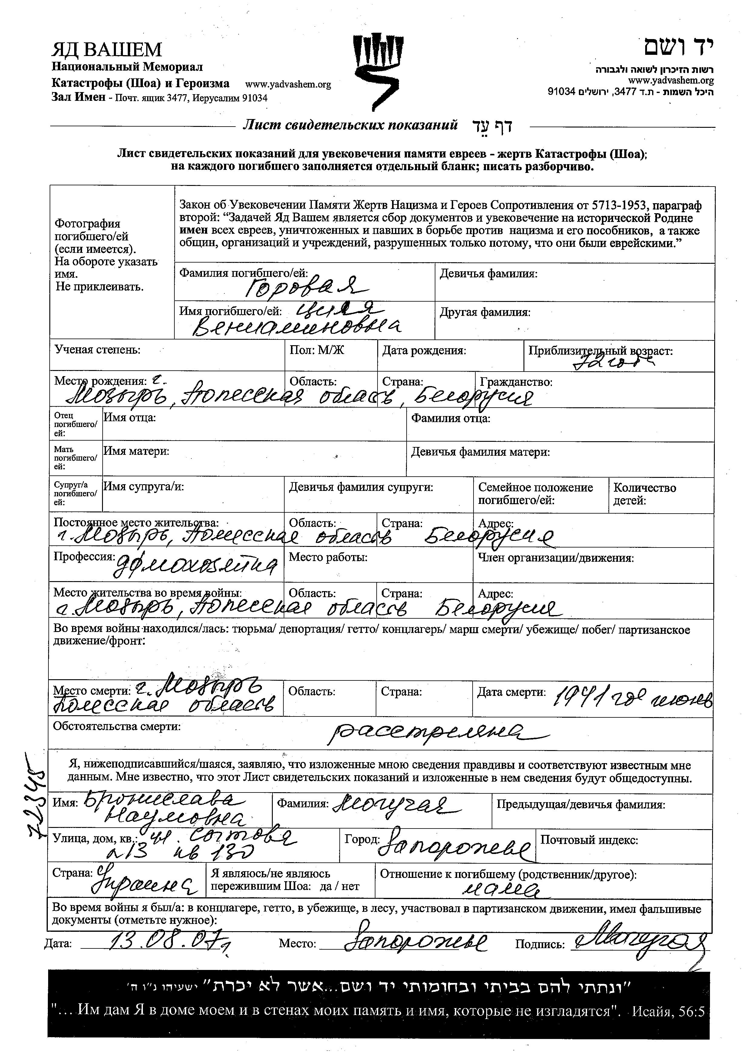 Yad Vashem - Pages of Testimony Names Memorial Collection