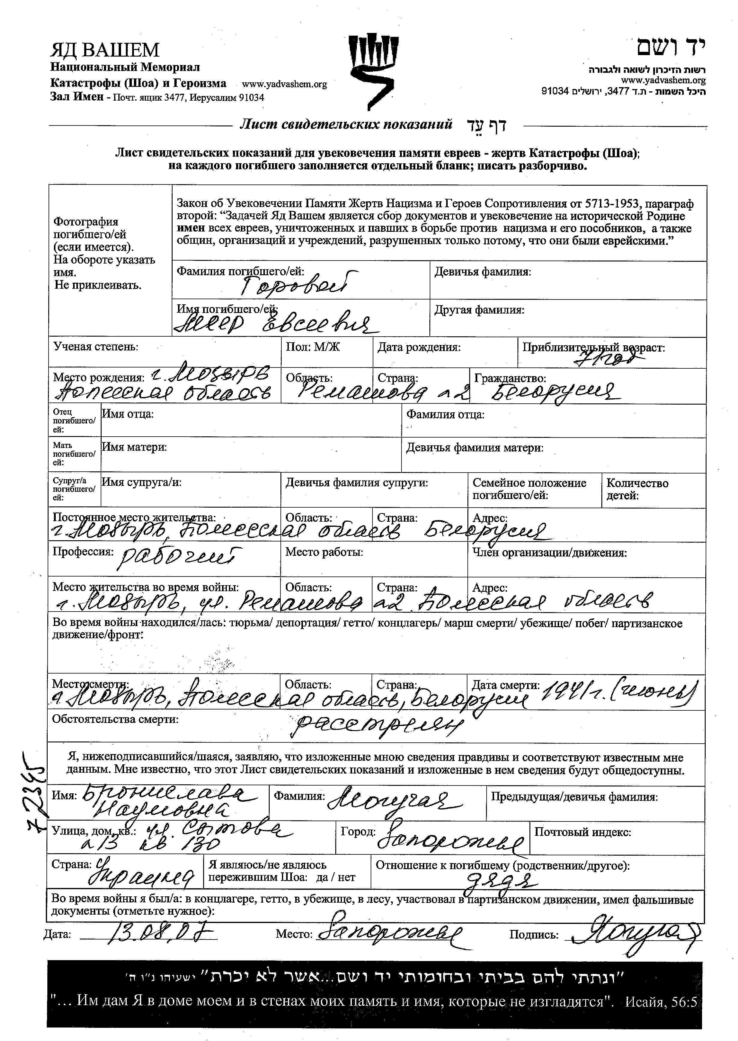 Gorovoi Meyer Mozyr, Bélorussie (URSS) Feuille de témoignage