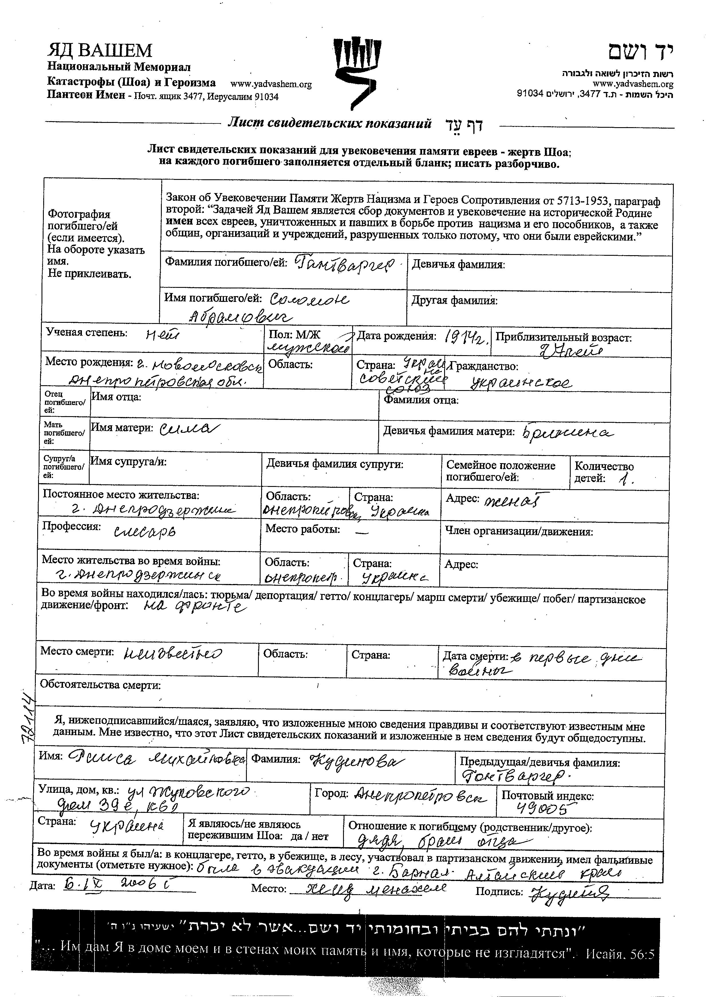 Gantvarger Solomon 1914 Dneprodzerzhinsk, Ukraine (URSS) Feuille de témoignage