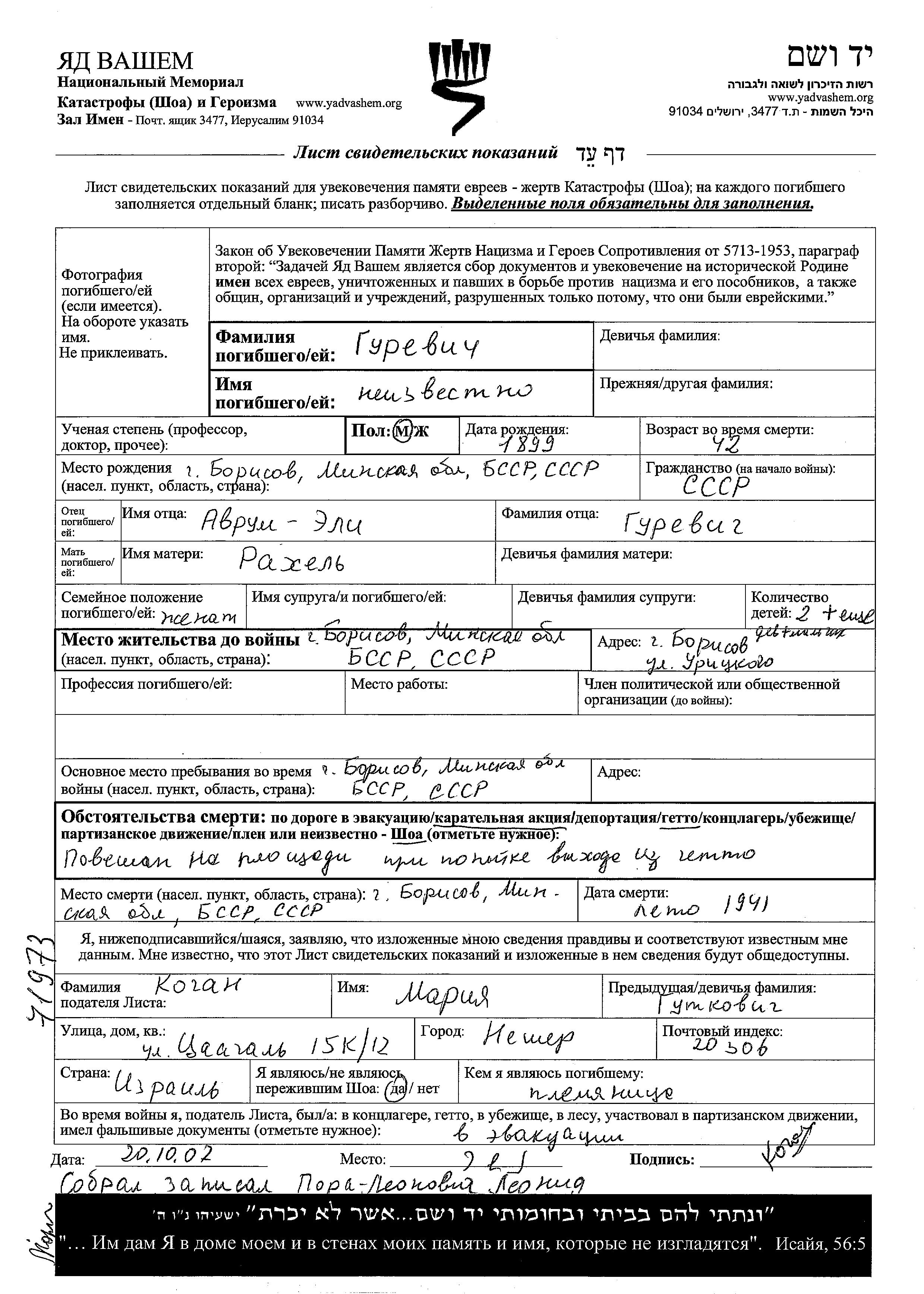 Gurevich prénom inconnu 1899 Borisov, Bélorussie (URSS) Feuille de témoignage