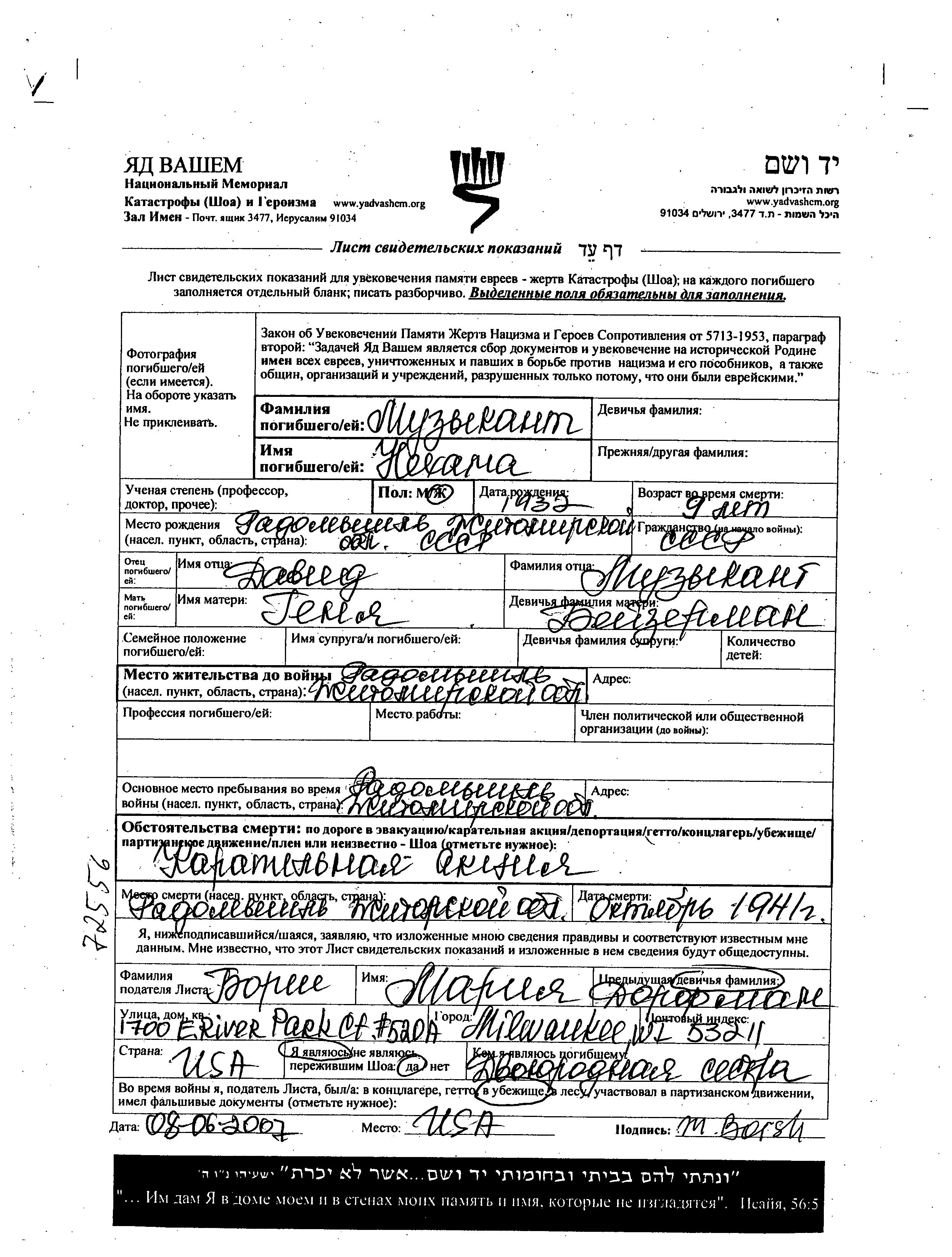 Yad Vashem - Pages of Testimony Names Memorial Collection