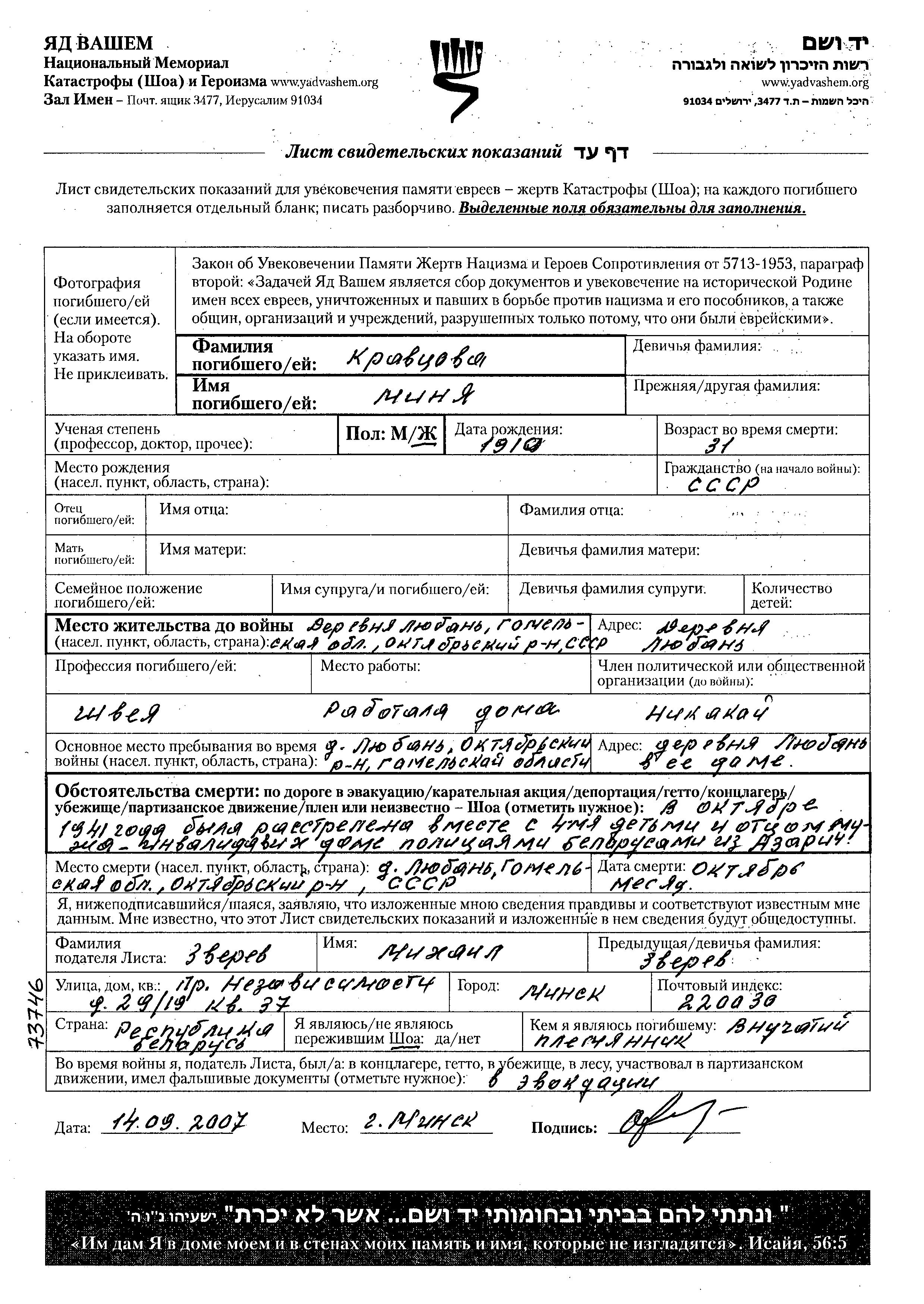 Kravtzova Minya 1910 Lyuban, Bélorussie (URSS) Feuille de témoignage