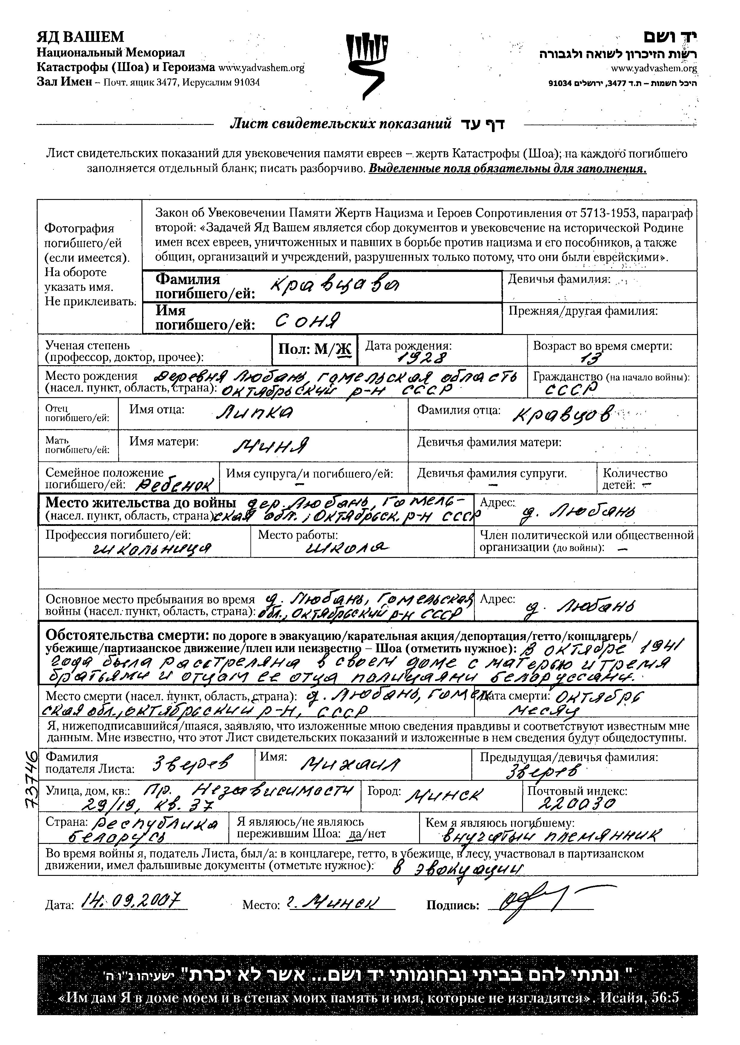 Kravtzova Sonya 1928 Lyuban, Bélorussie (URSS) Feuille de témoignage