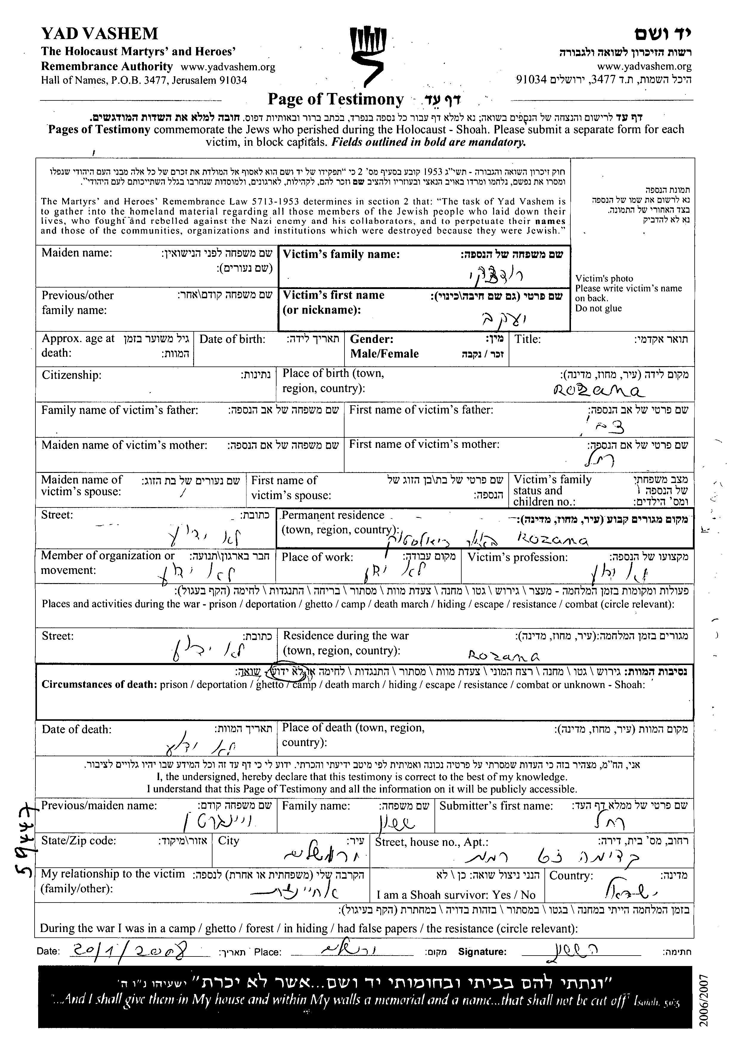 Rudetzki Yaakov Rozana, Pologne Feuille de témoignage