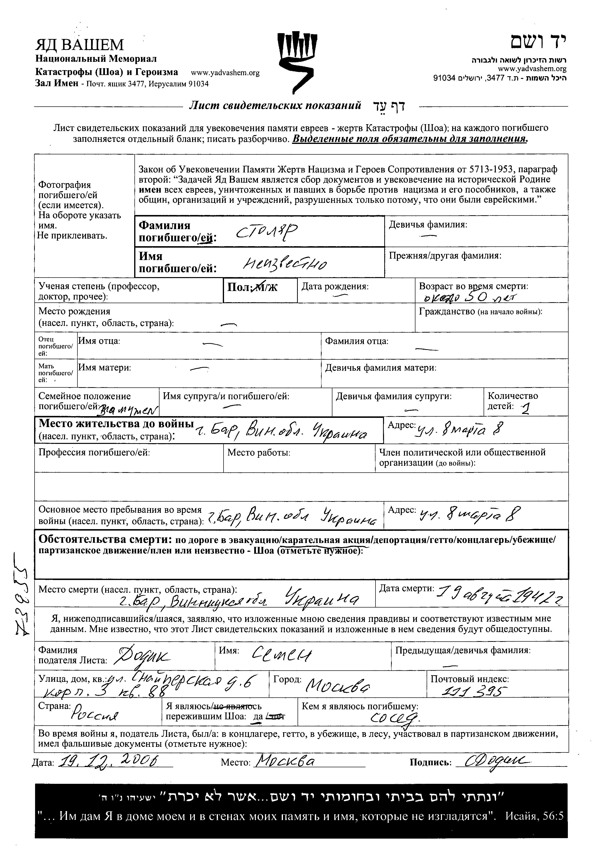 Stolyar prénom inconnu Bar, Ukraine (URSS) Feuille de témoignage