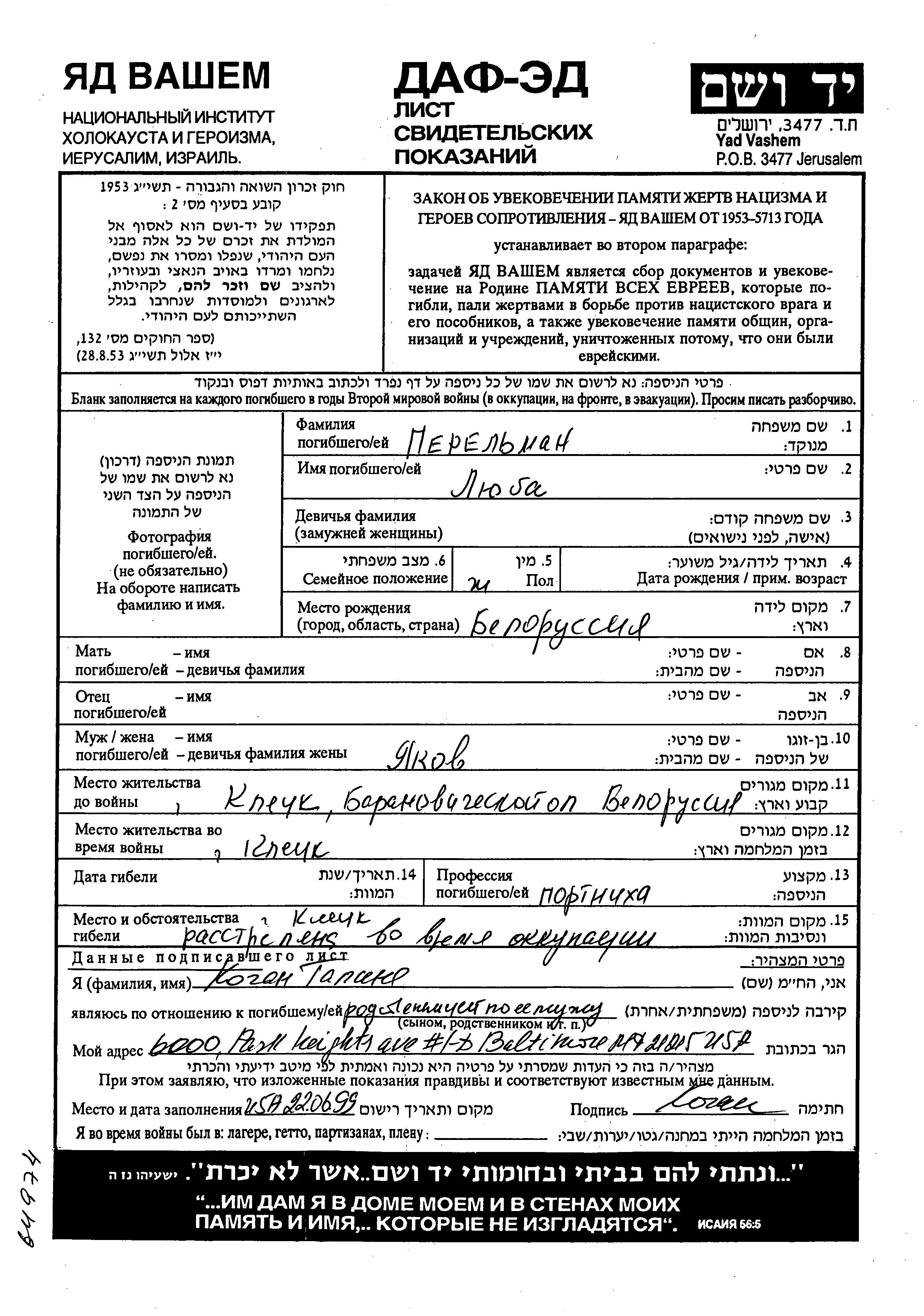 Perelman Lyuba Kletzk, Pologne Feuille de témoignage