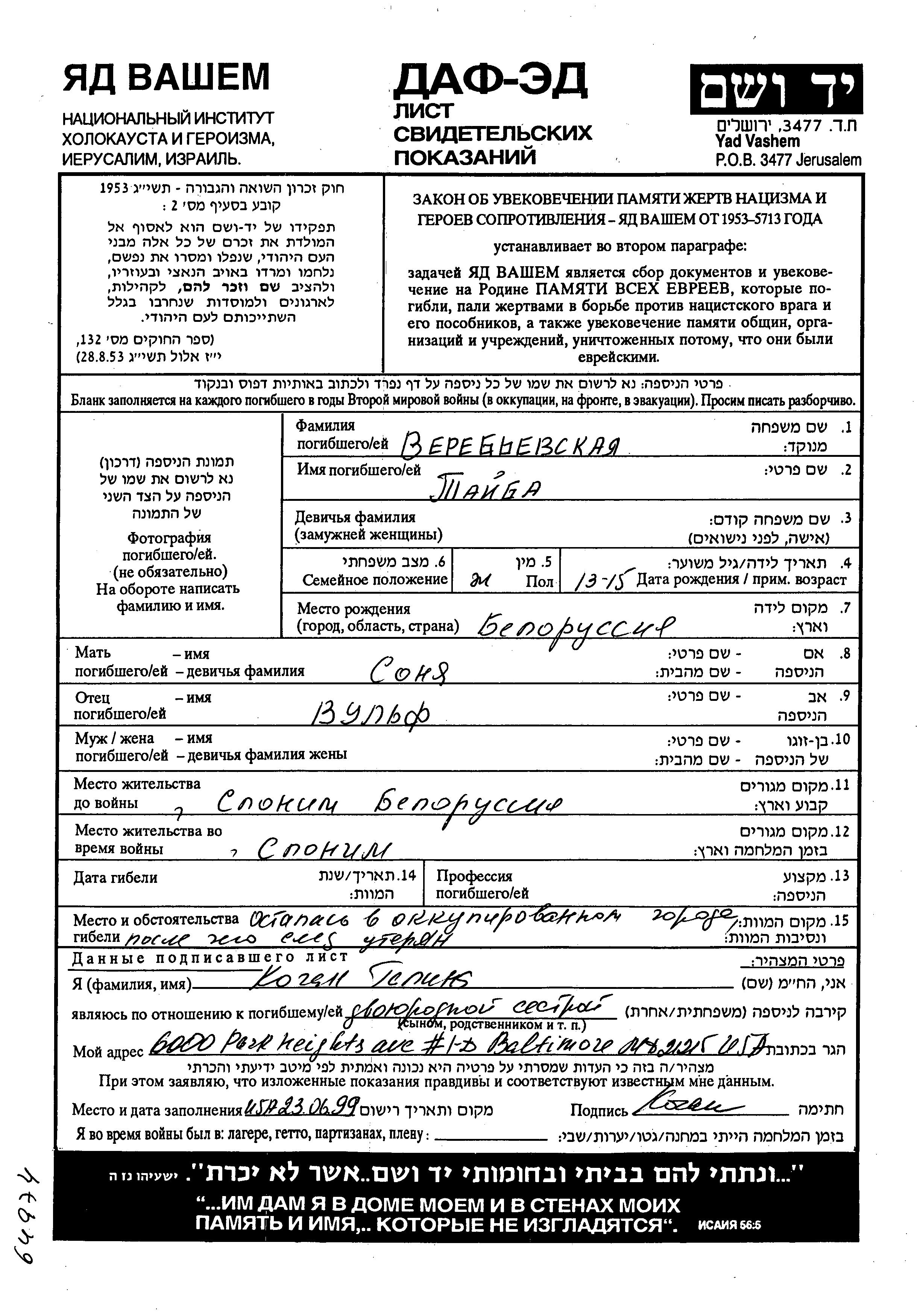 Verebyevskaya Taiba Slonim, Pologne Feuille de témoignage