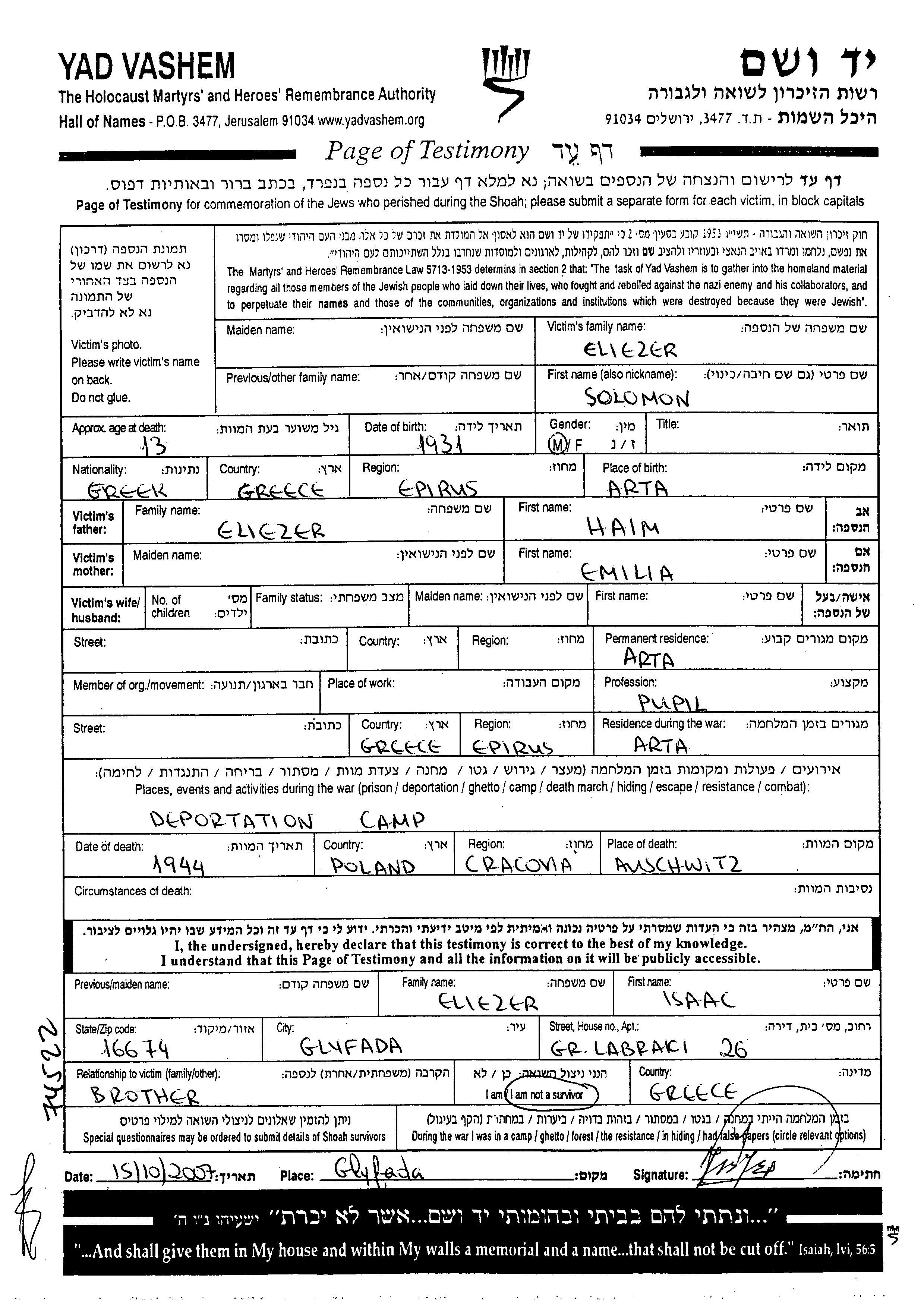 Eliezer Solomon 1931 Arta, Grèce Feuille de témoignage
