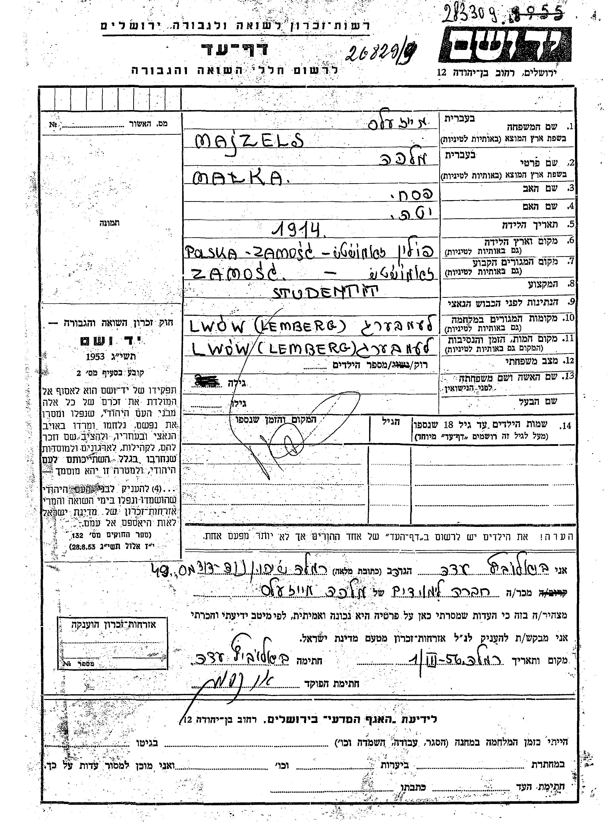 Majzels Malka 1914 Zamosc, Pologne Feuille de témoignage