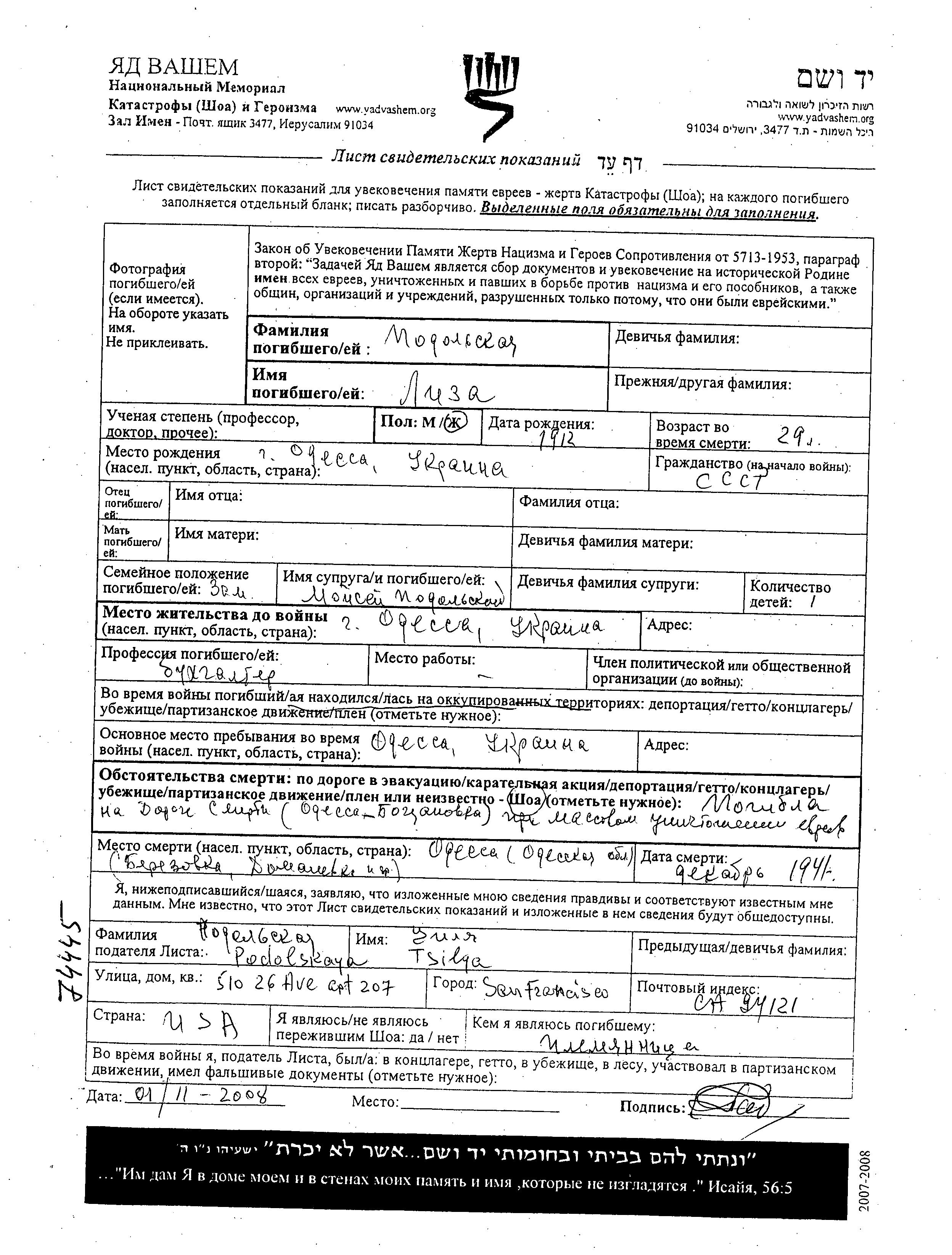 Podolskaya Liza 1912 Odessa, Ukraine (URSS) Feuille de témoignage