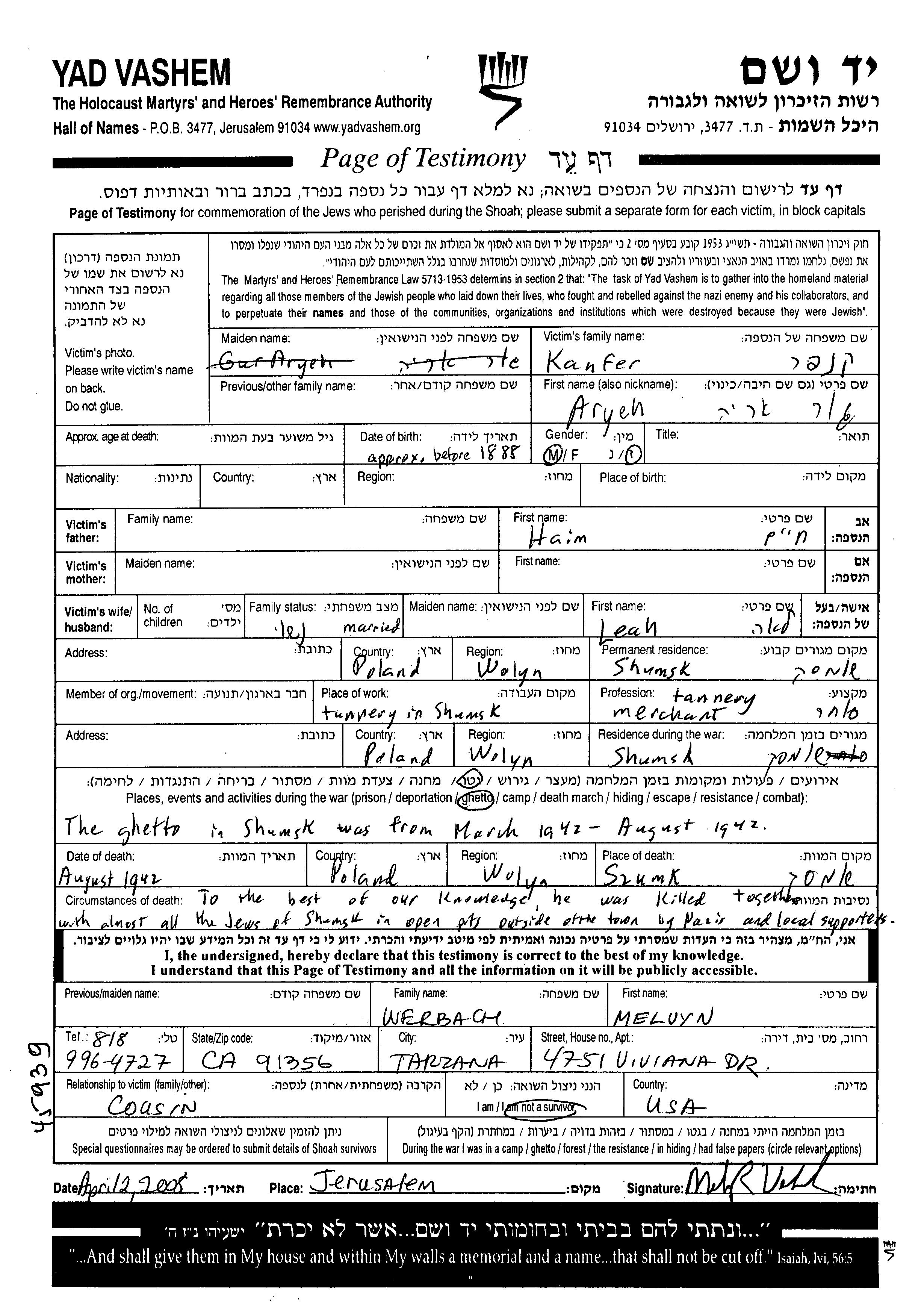 Kanfer Gur Arie Aryeh 1888 Shumsk, Pologne Feuille de témoignage