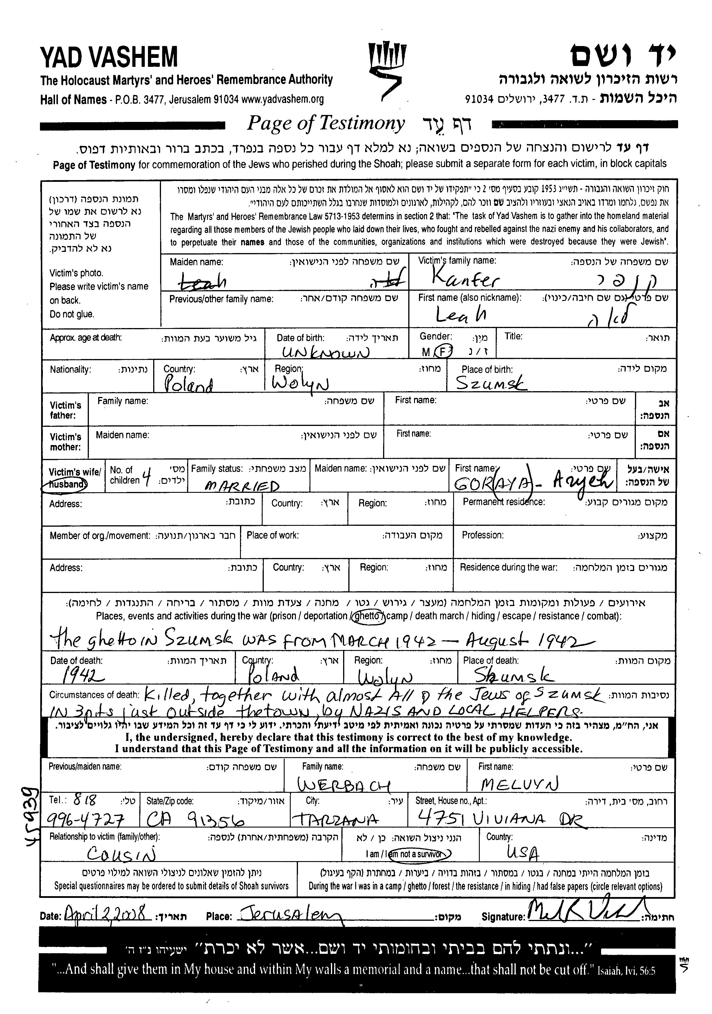 Kanfer Leah Szumsk, Pologne Feuille de témoignage