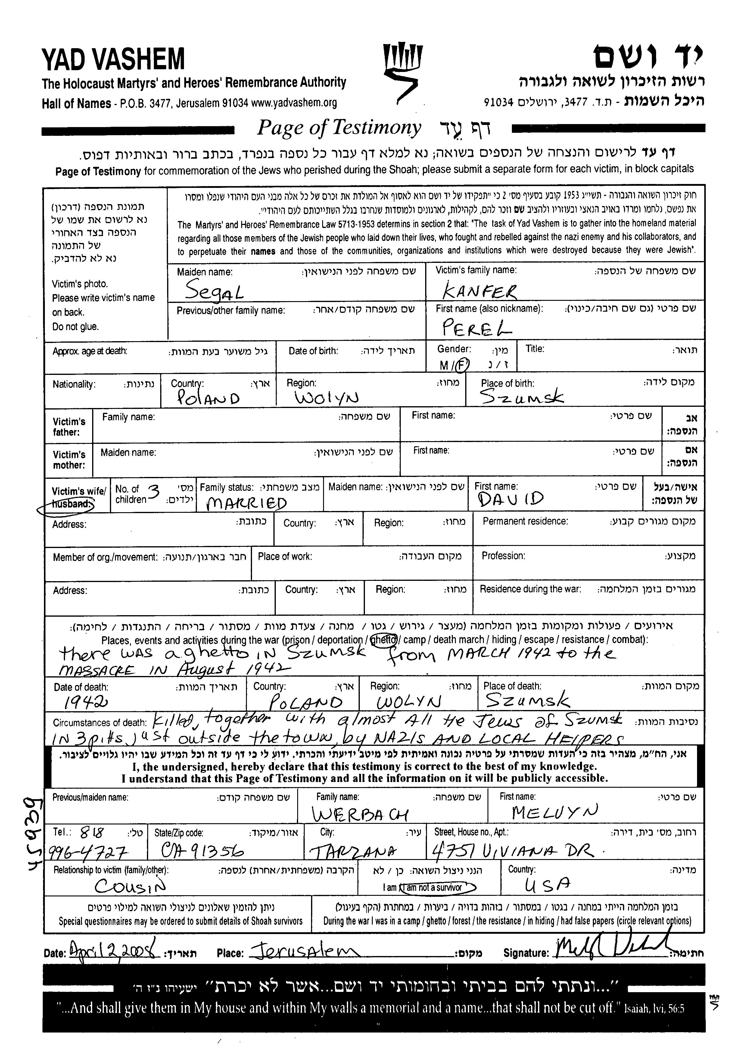 Kanfer Perel Szumsk, Pologne Feuille de témoignage