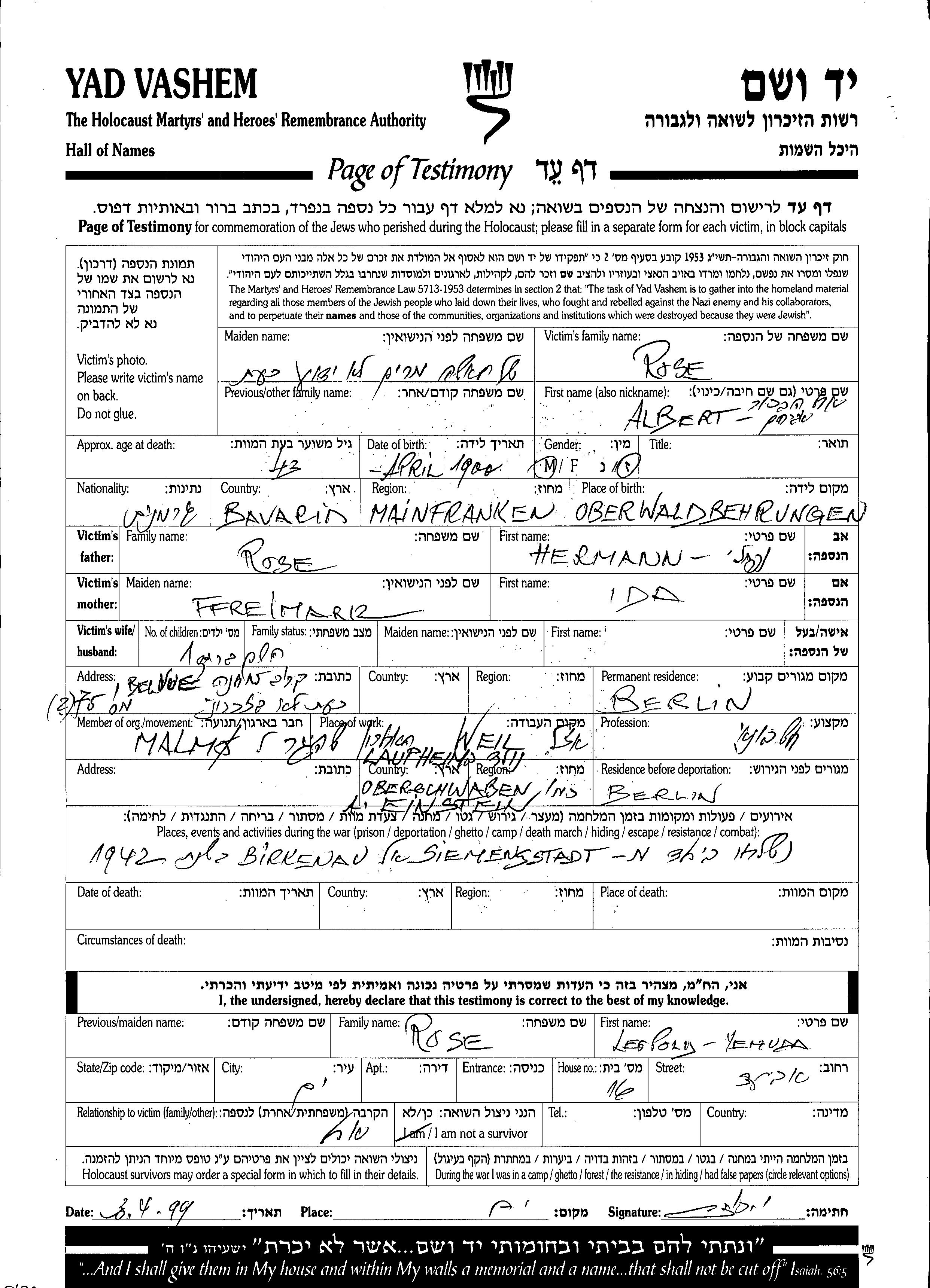Rose Albert Avraham 1900 Berlin, Allemagne Feuille de témoignage