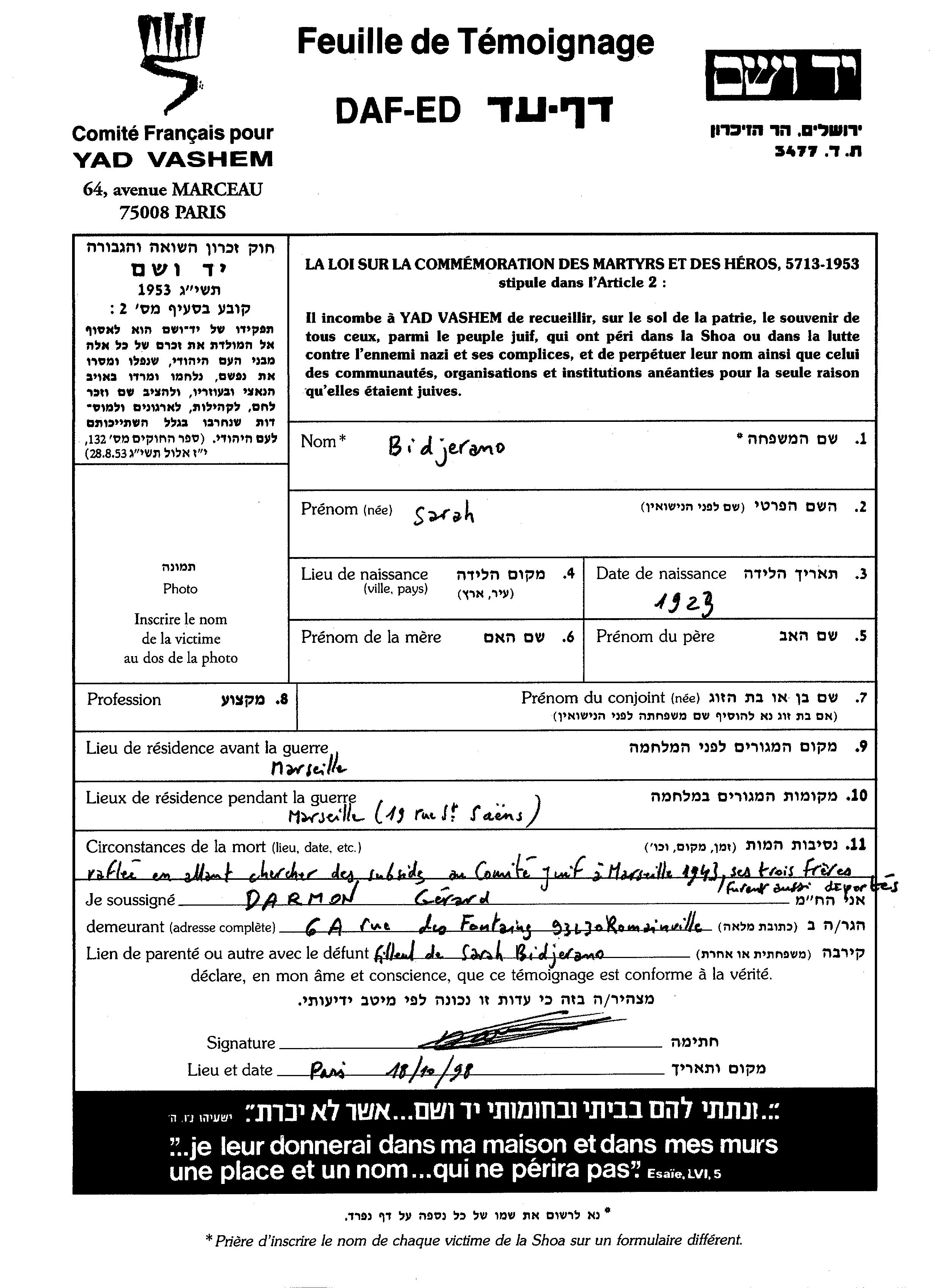 Bidjerano Sarah 1923 Marseille, France Feuille de témoignage