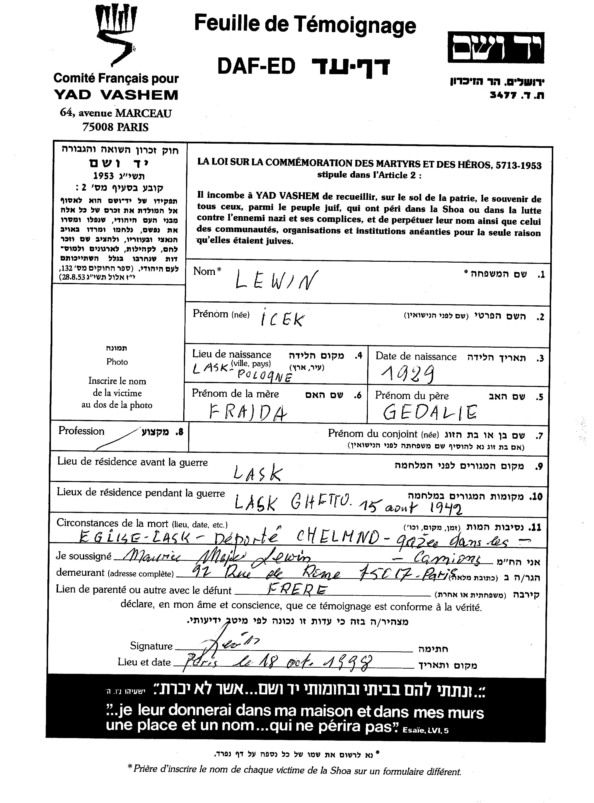 Lewin Icek 1929 Lask, Pologne Feuille de témoignage