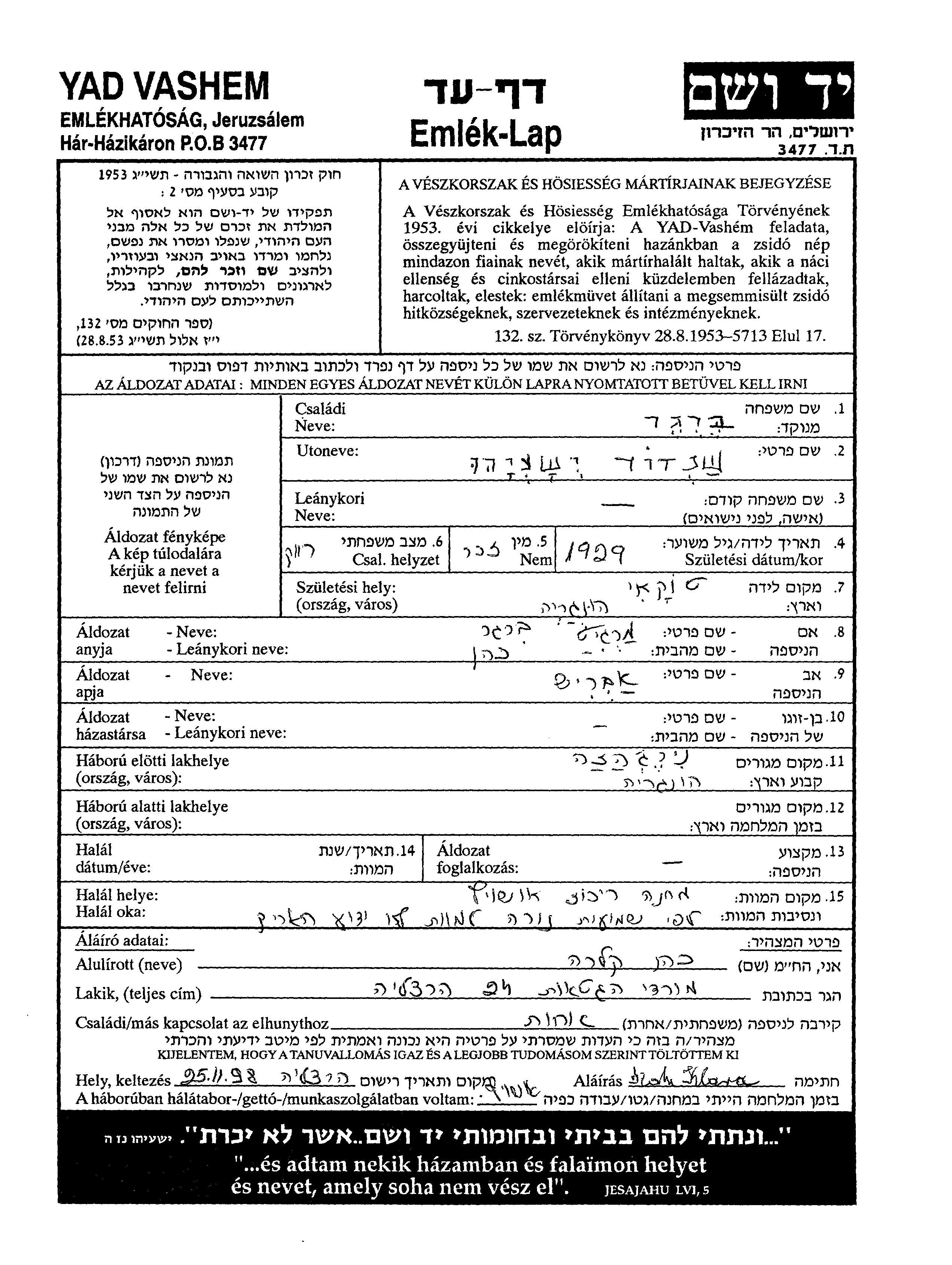 Berger Sandor Yeshayahu 1929 Niregyhaza, Hongrie Feuille de témoignage