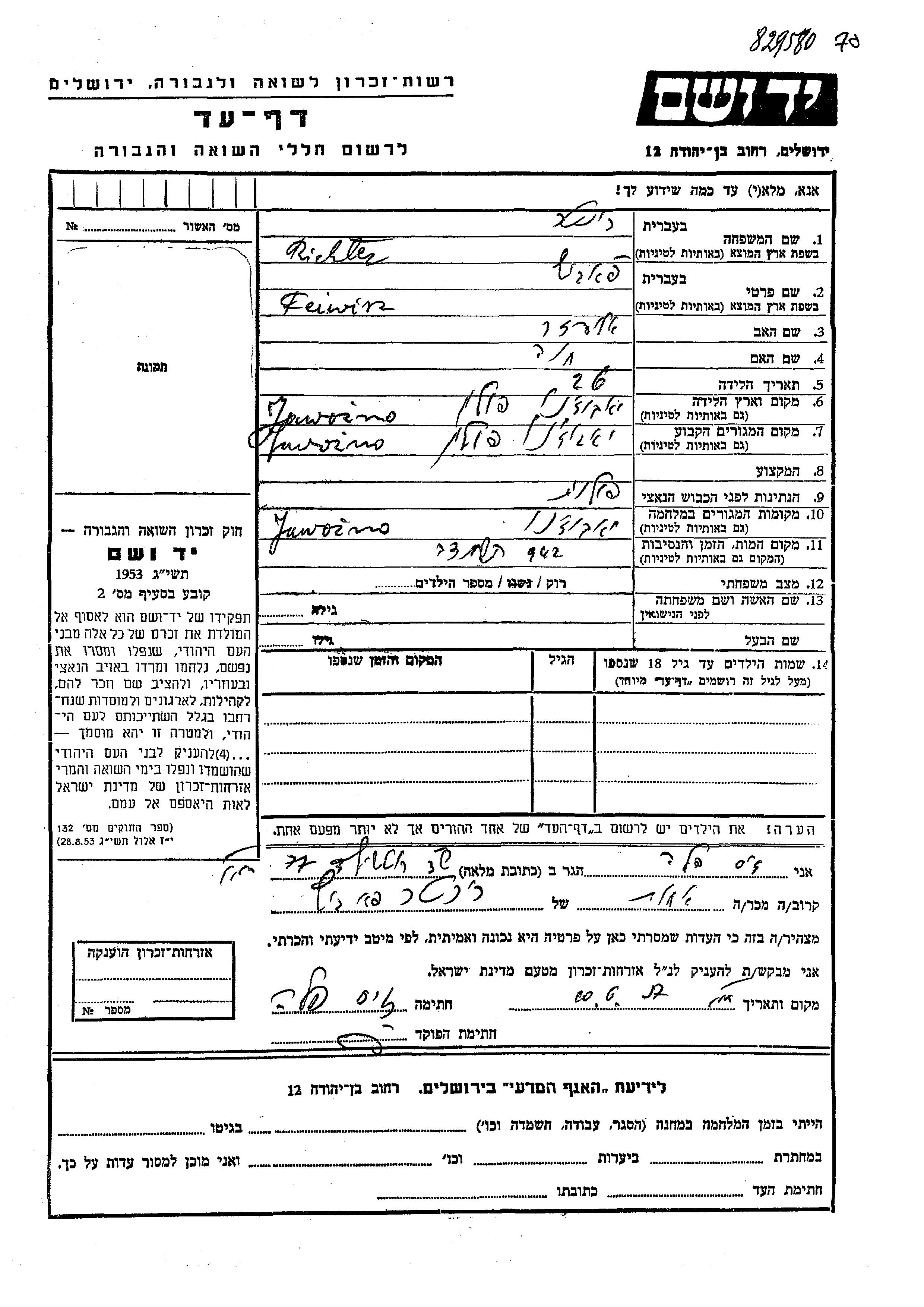 Rikhter Feiwisz Jaworzno, Pologne Feuille de témoignage