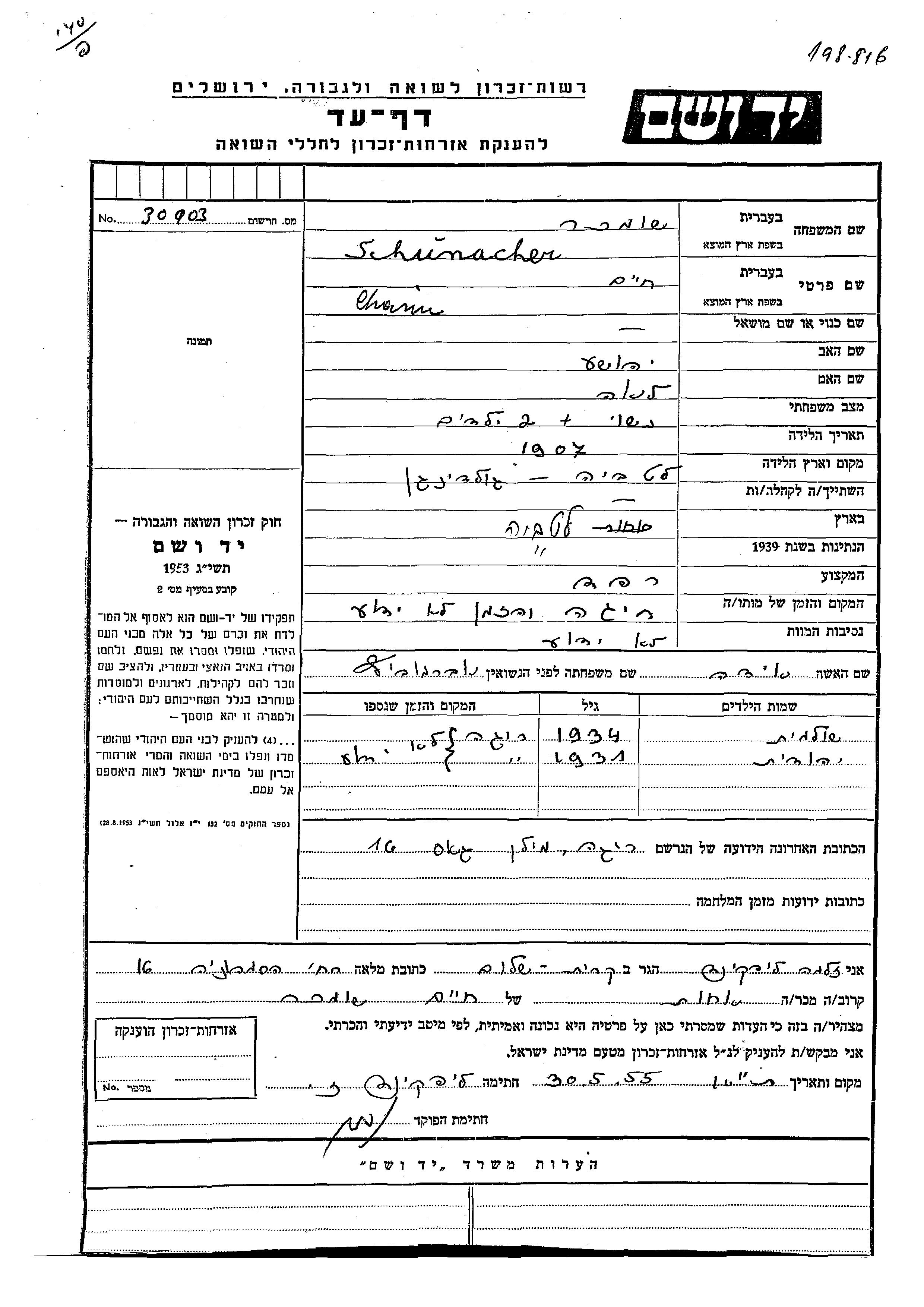 Schumacher Chaim 1907 endroit inconnu, Feuille de témoignage