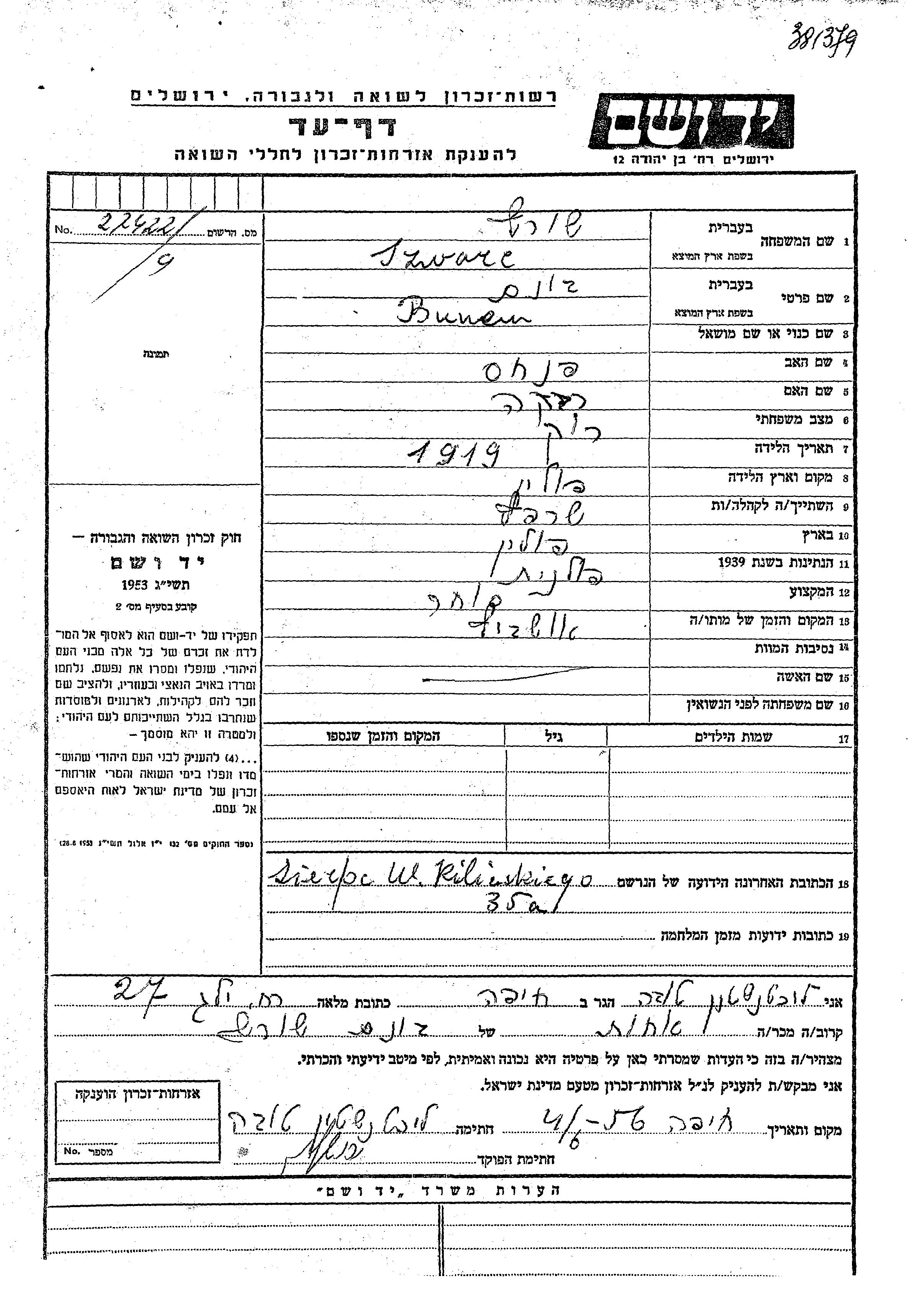 Bunem Szvarc est né à Pologne en 1919, fils de Pinkhas et de Rivka. Il était Commerçant/e et Célibataire. Avant la seconde guerre mondiale il vivait à Sierpc, Pologne. Au cours de la guerre, il était à Pologne.