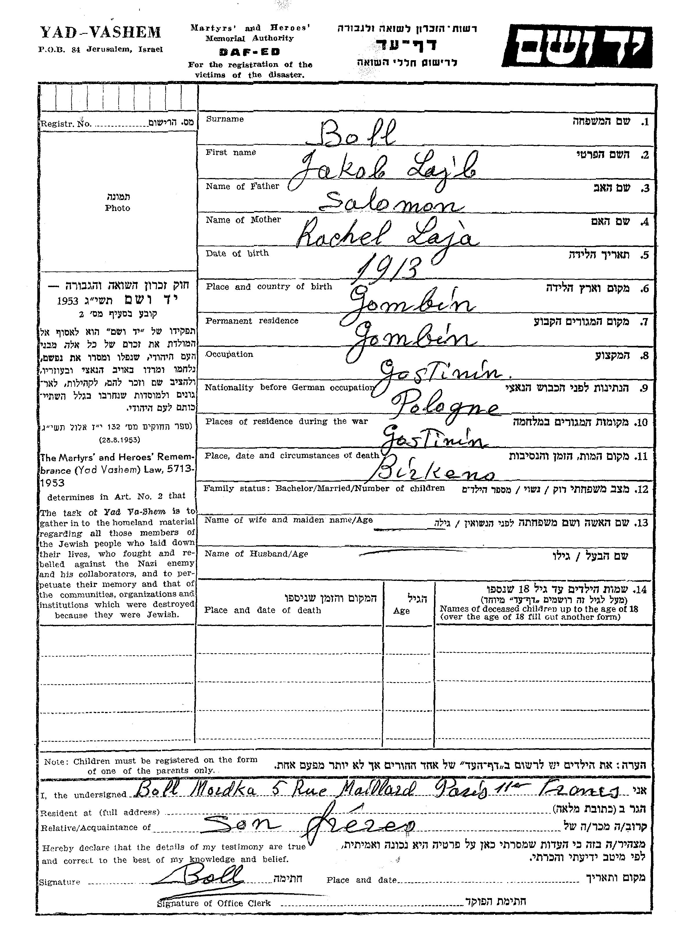 Jakob Lajb Boll est né à Gombin, Pologne en 1913, fils de Salomon et de Rachel Laja. Avant la seconde guerre mondiale il vivait à Gombin, Pologne. Au cours de la guerre, il était à Gostinin, Pologne.
