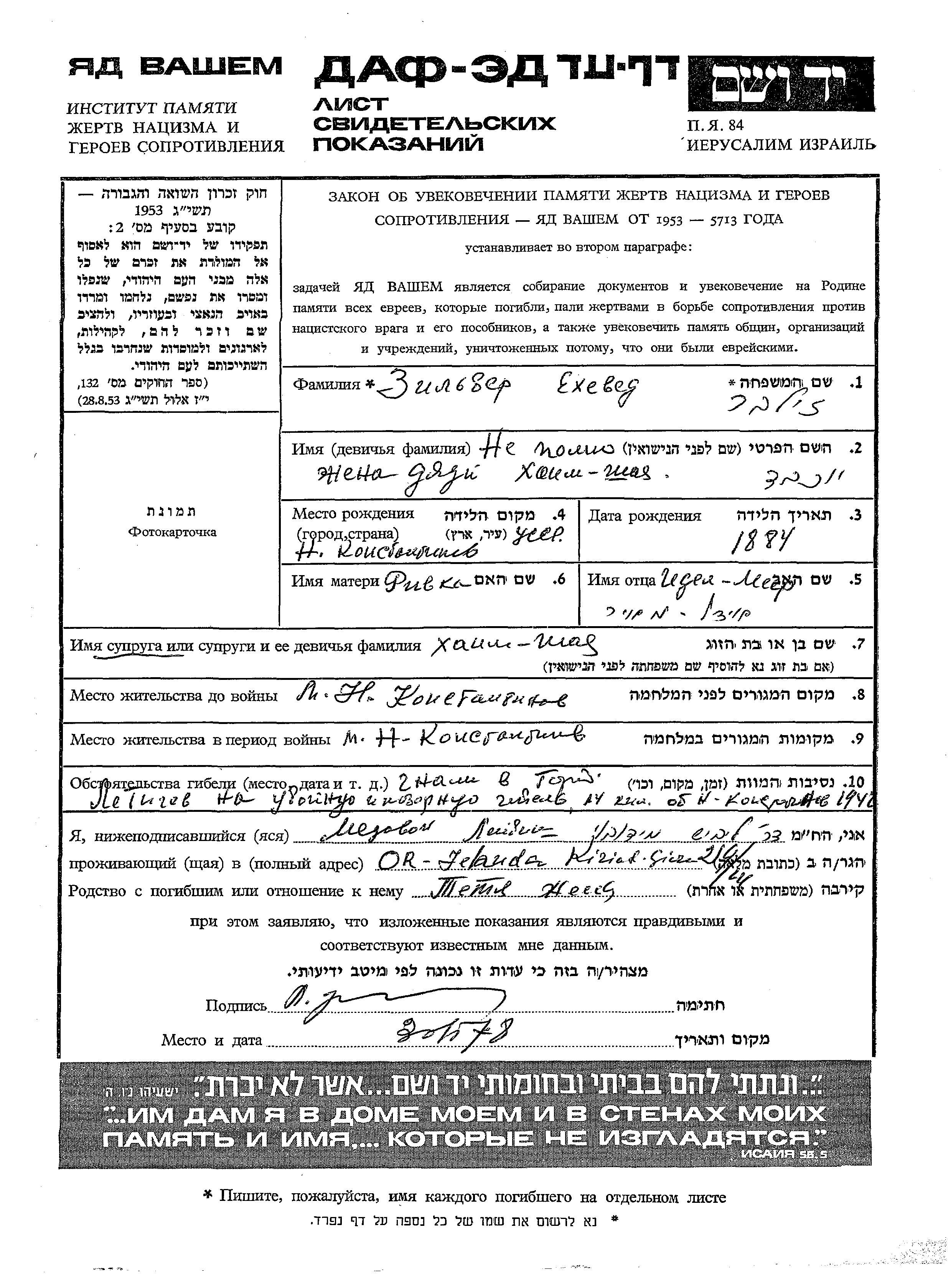 Zilber Yokheved 1884 Konstantinov, Pologne Feuille de témoignage