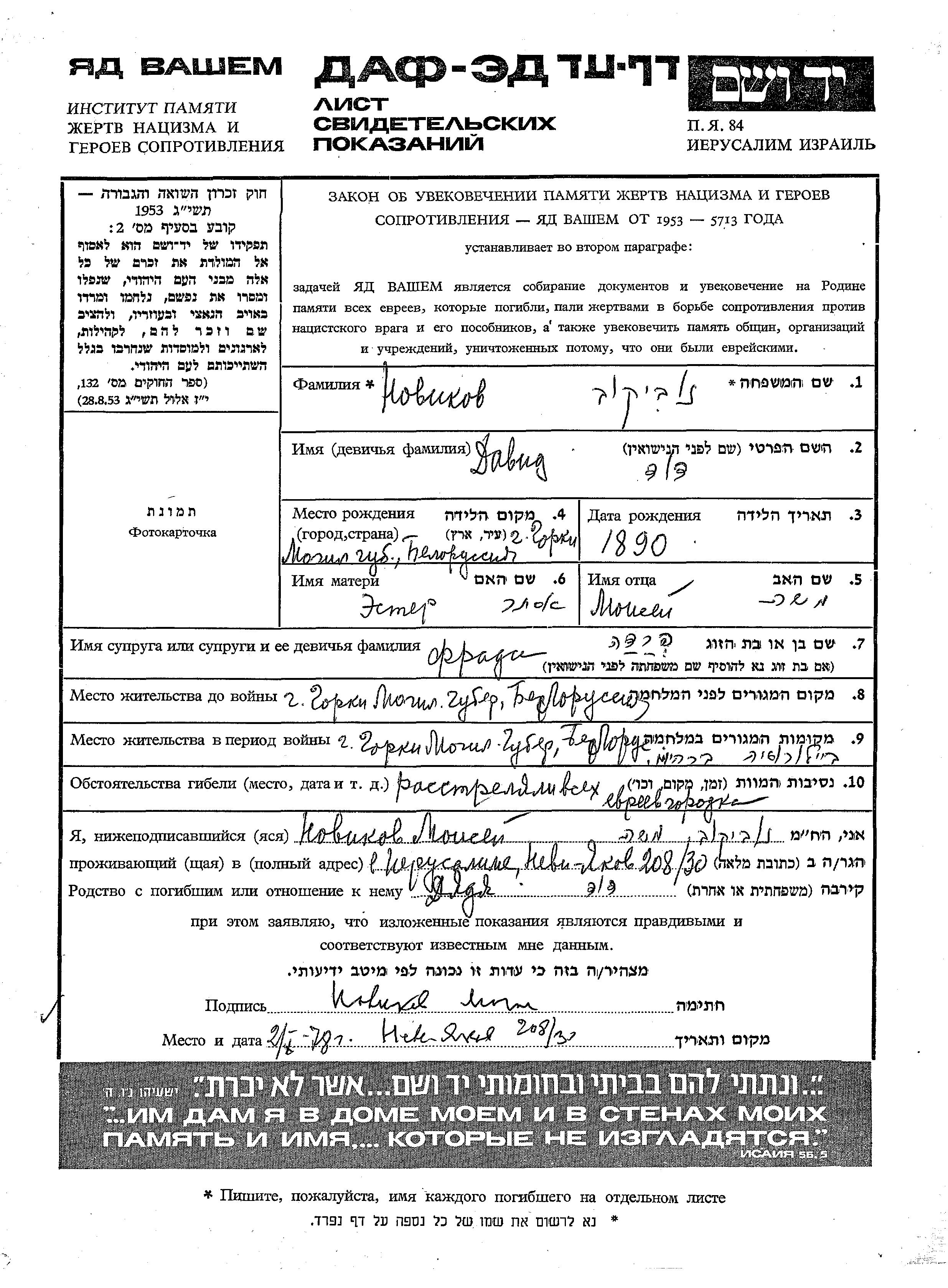 Novikov David 1890 Gorki, Bélorussie (URSS) Feuille de témoignage