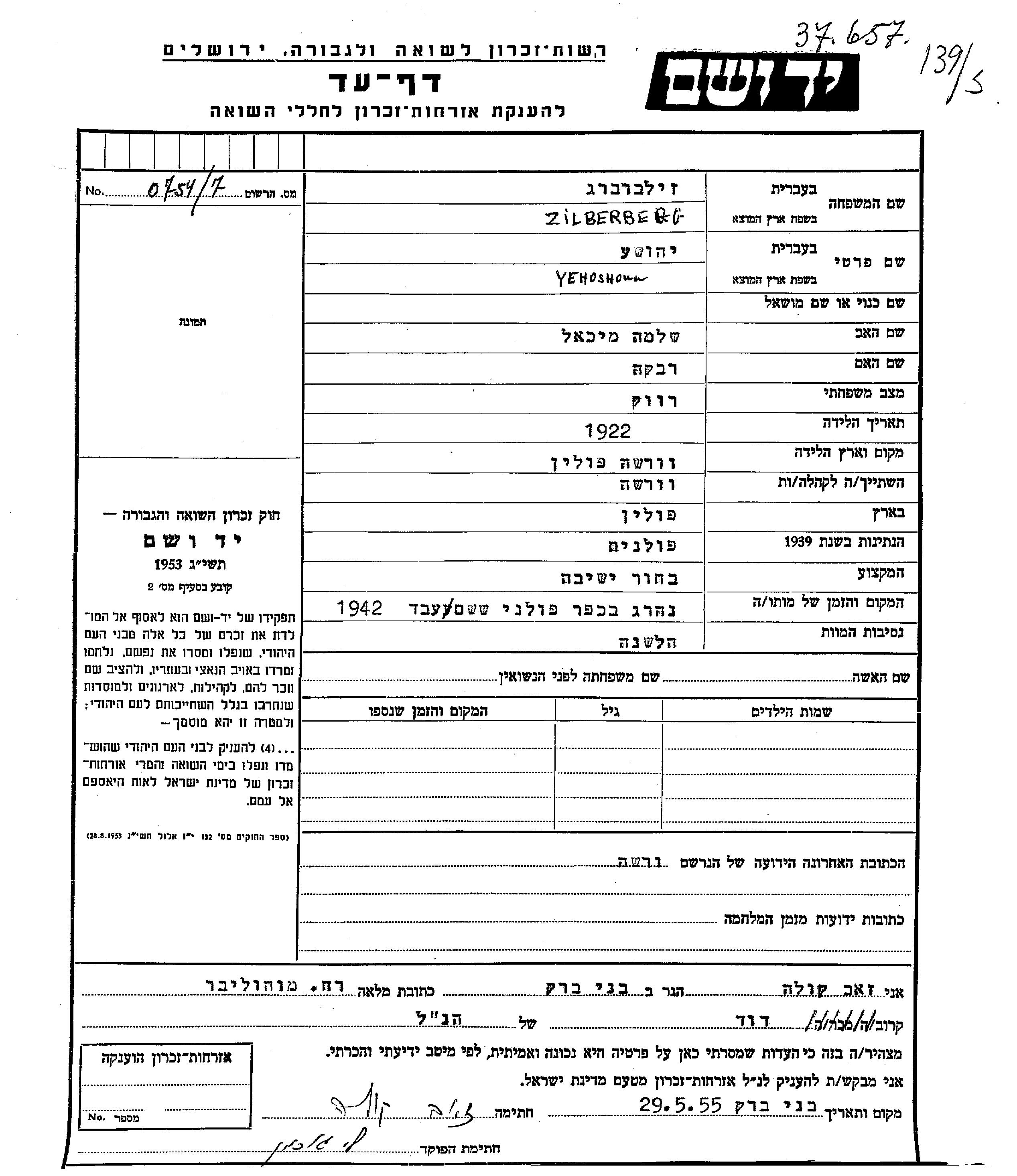 Zilberberg Yehoshua 1922 Warszawa, Pologne Feuille de témoignage