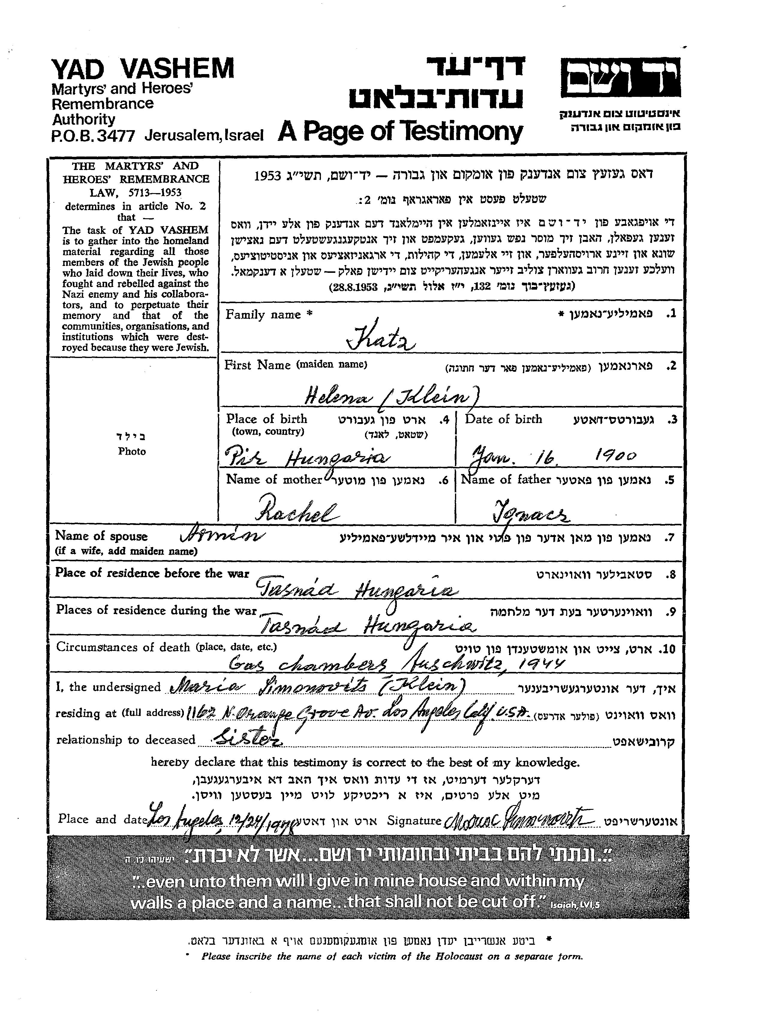 Katz Helena 1900 Tasnad, Roumanie Feuille de témoignage