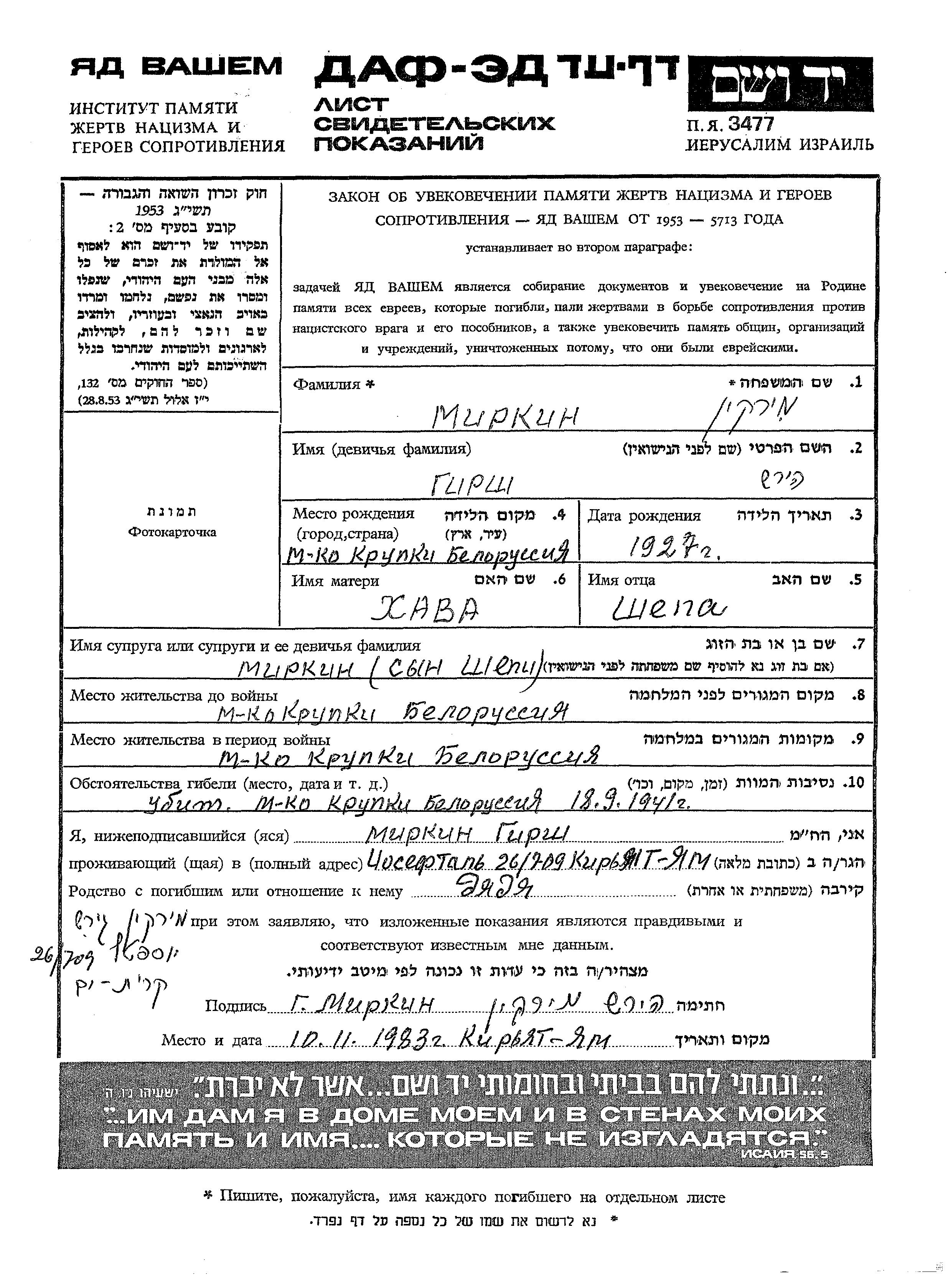 Mirkin Hirsh 1927 Krupki, Bélorussie (URSS) Feuille de témoignage
