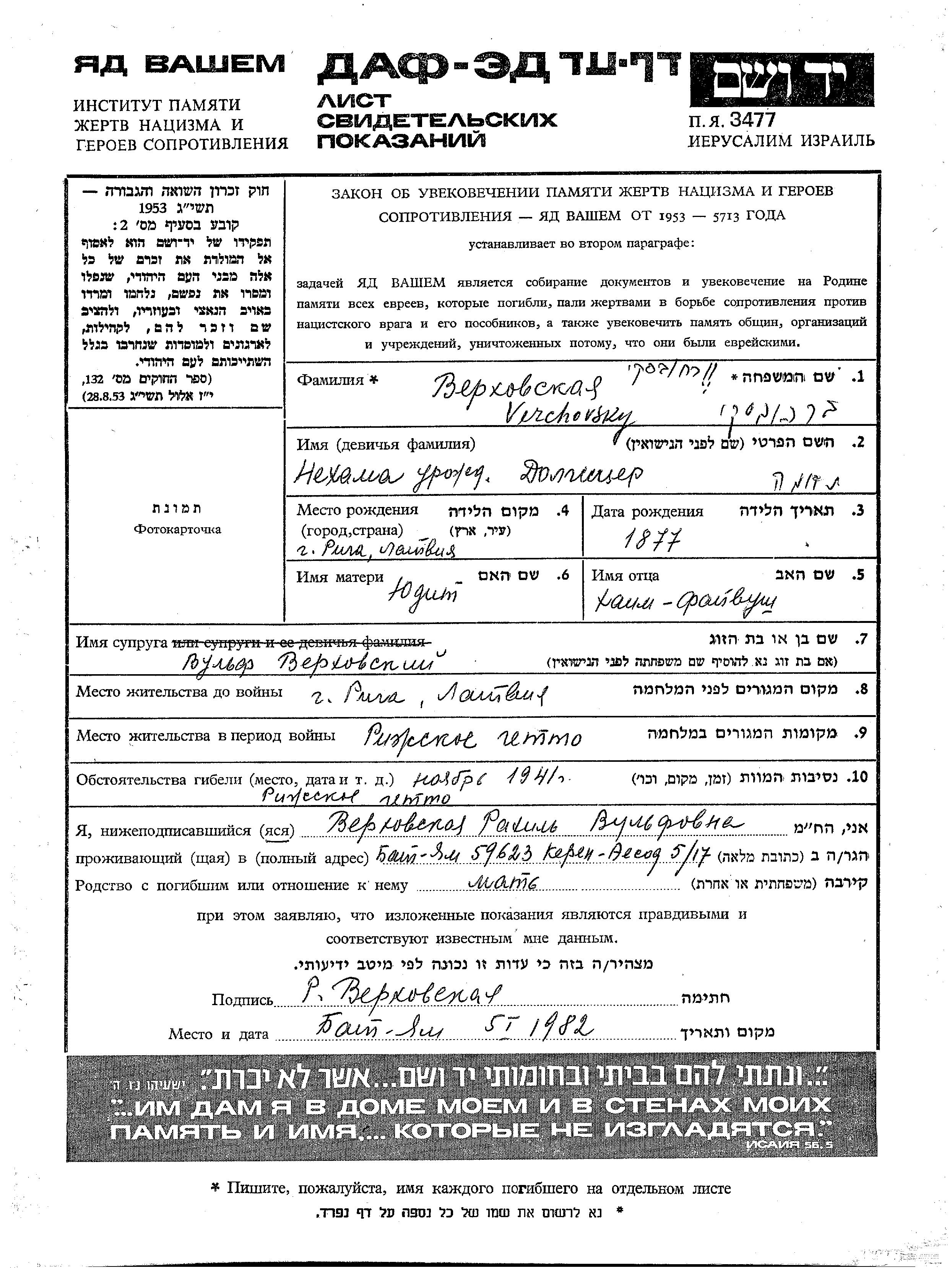 Nekhama Verkhovski née Dolgitzer est née à Riga, Lettonie en 1877, fille de Khaim Faivush et de Yudit. Elle était Mariée à Vulf. Avant la seconde guerre mondiale elle vivait à Riga, Lettonie. Pendant la guerre, elle était à Riga, Lettonie.