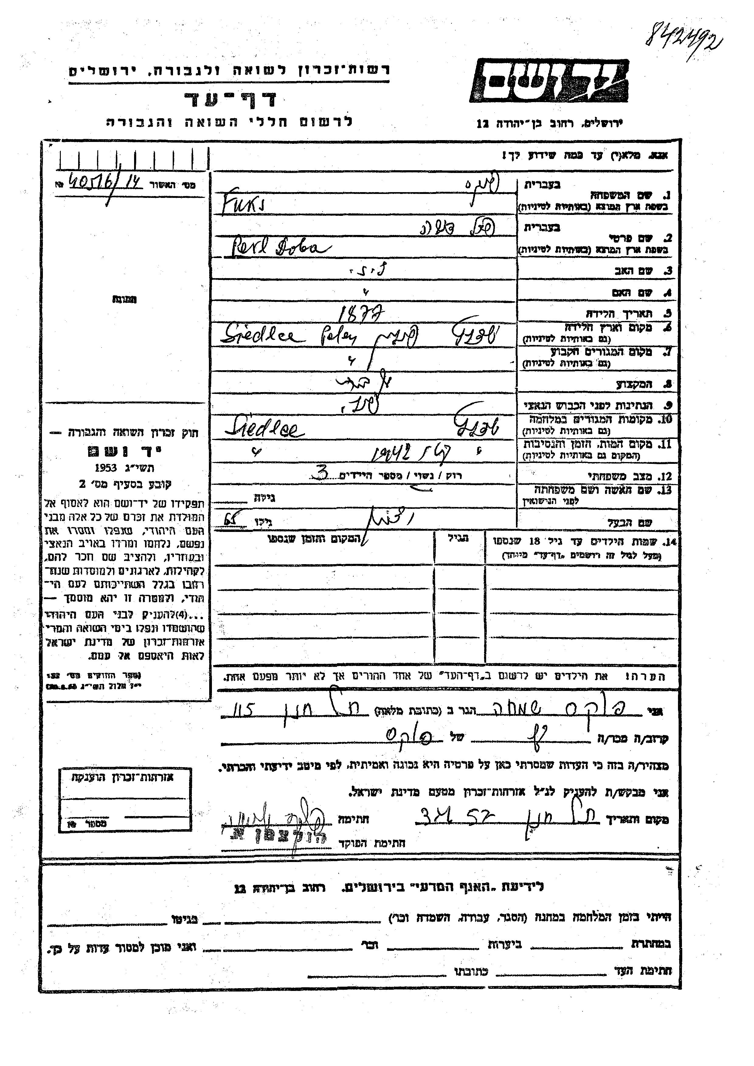 Perl Doba Fuks est née à Siedlce, Pologne en 1877. Elle était Femme au foyer et Mariée à Yitzkhak. Avant la seconde guerre mondiale elle vivait à Siedlce, Pologne. Pendant la guerre, elle était à Siedlce, Pologne.