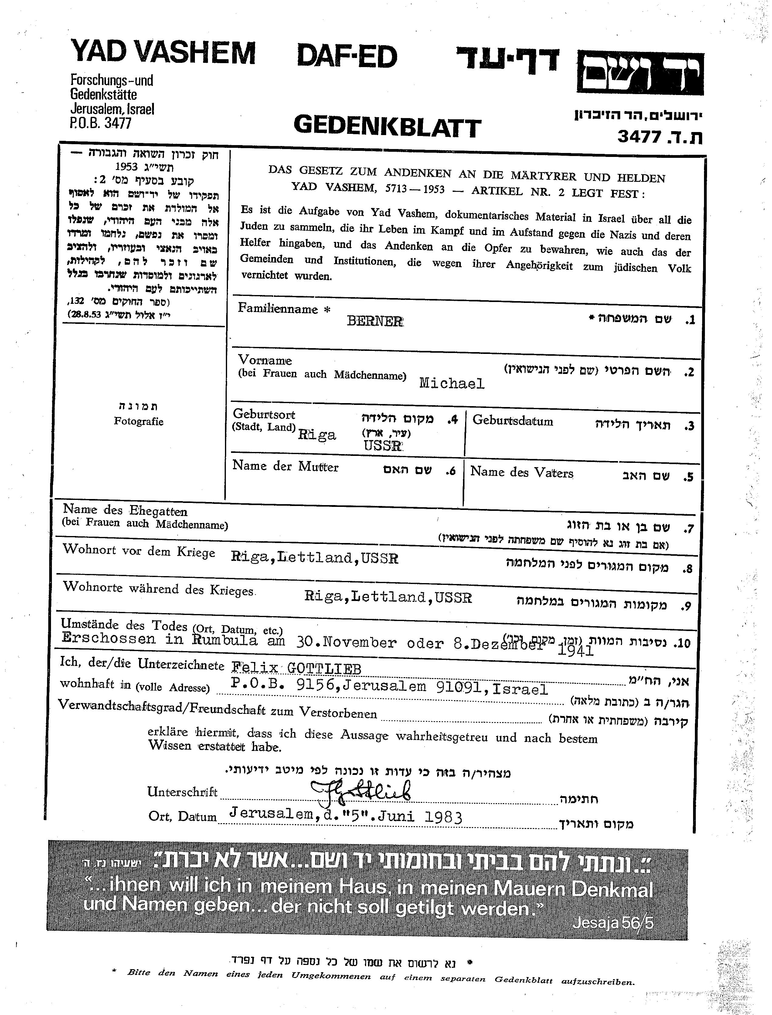 Berner Brener Michael Riga, Lettonie Feuille de témoignage