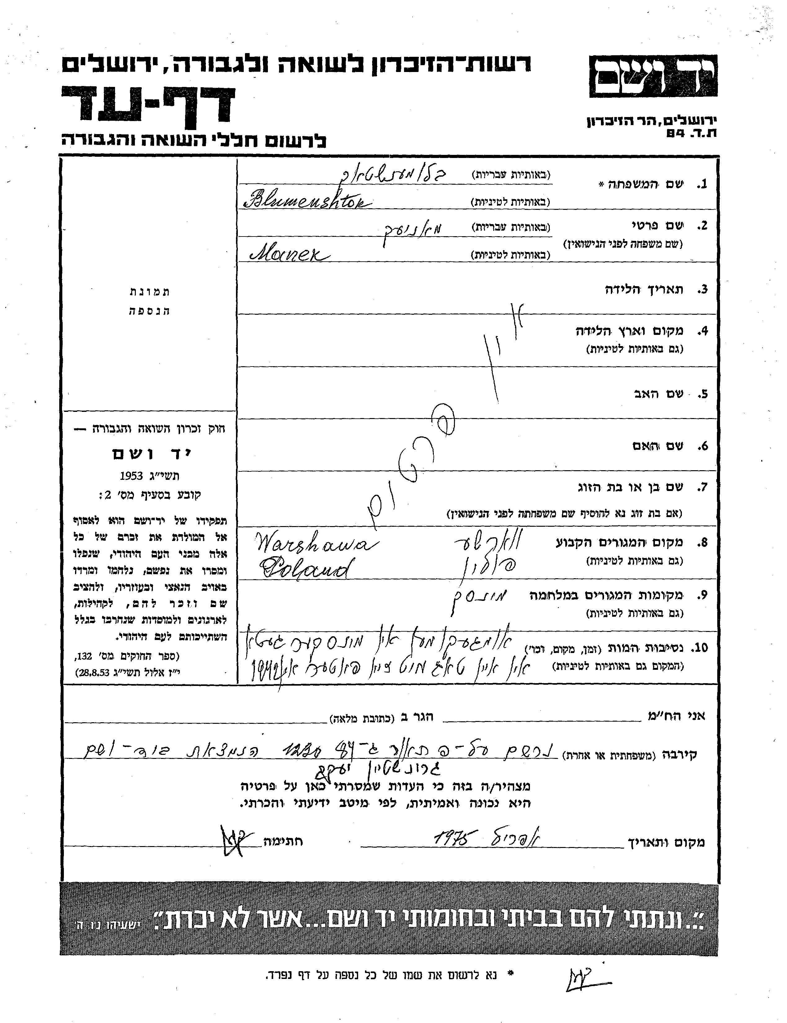 Blumenshtok Manek Warsaw, Pologne Feuille de témoignage