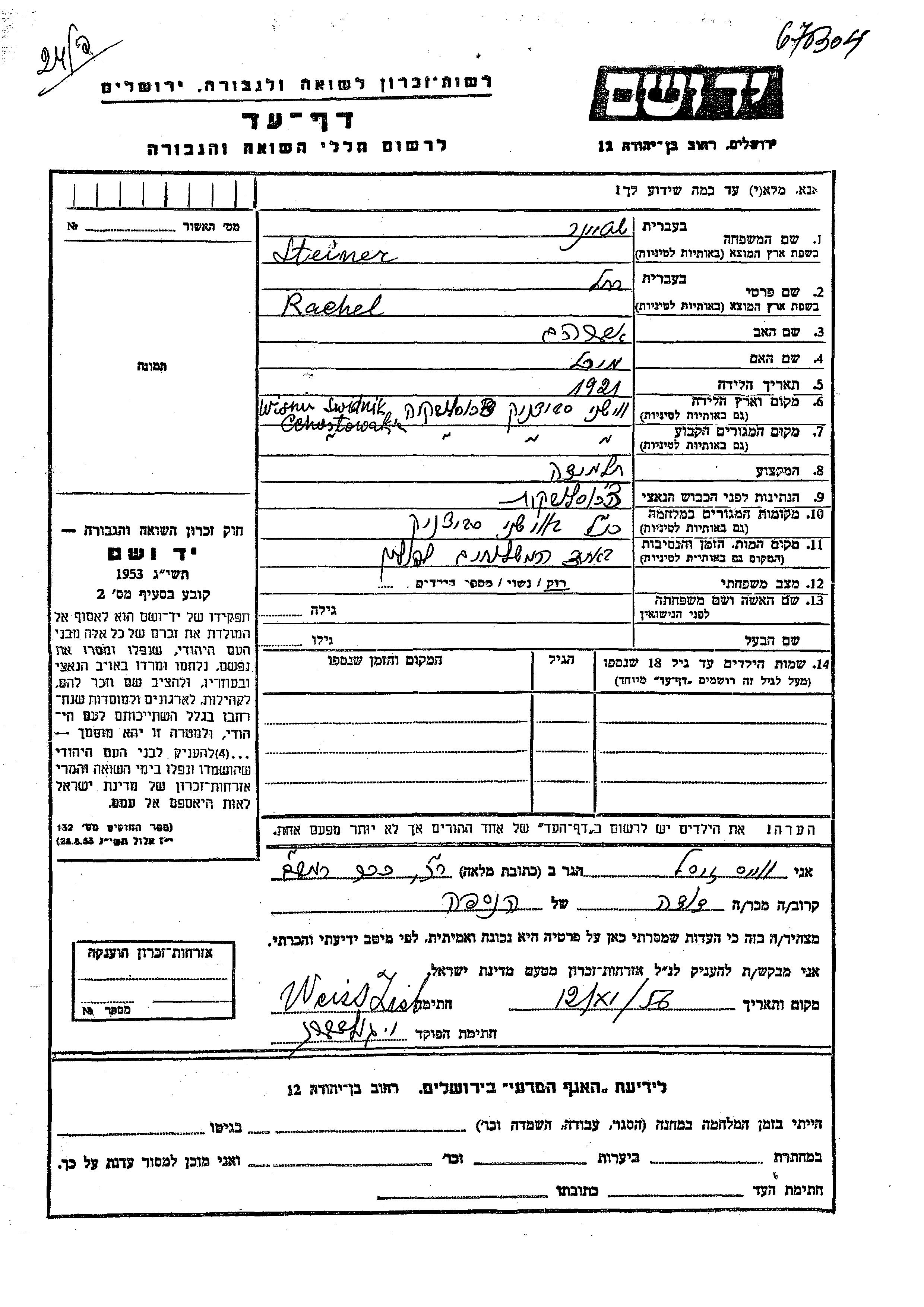 Steiner Rachel 1921 Visny Svidnik, Tchécoslovaquie Feuille de témoignage