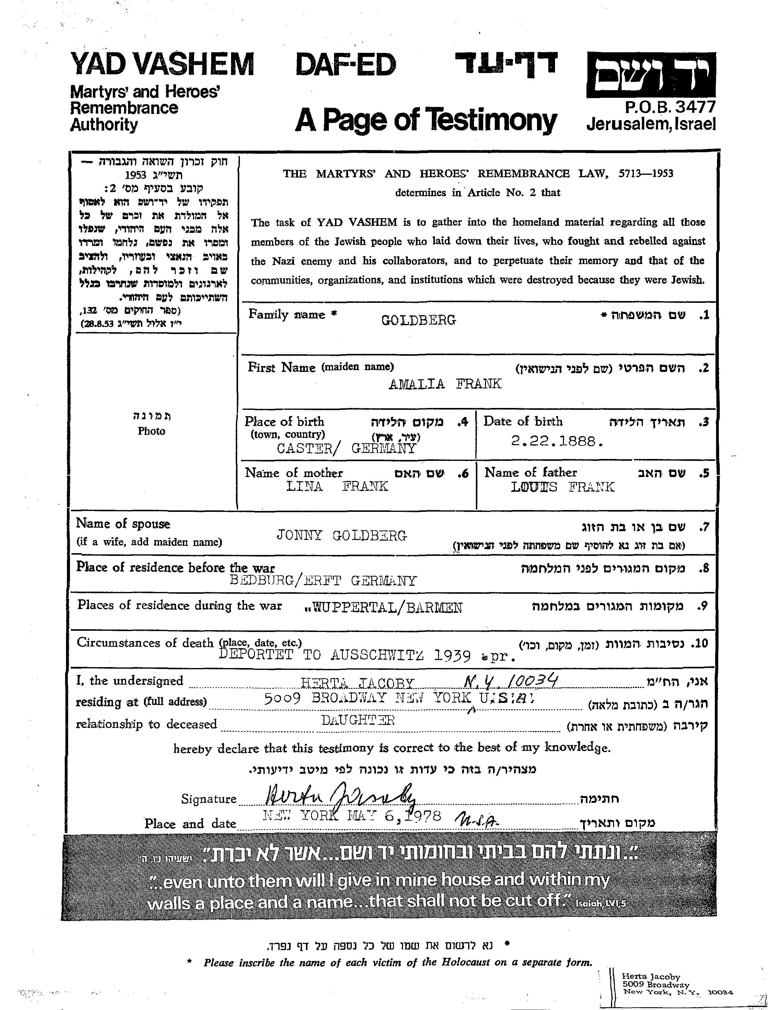 Amalia Goldberg née Frank est née à Caster, Allemagne en 1888, fille de Louis et de Lina. Avant la seconde guerre mondiale elle vivait à Bedburg, Allemagne. Pendant la guerre, elle était à Wuppertal Barmen, Allemagne.