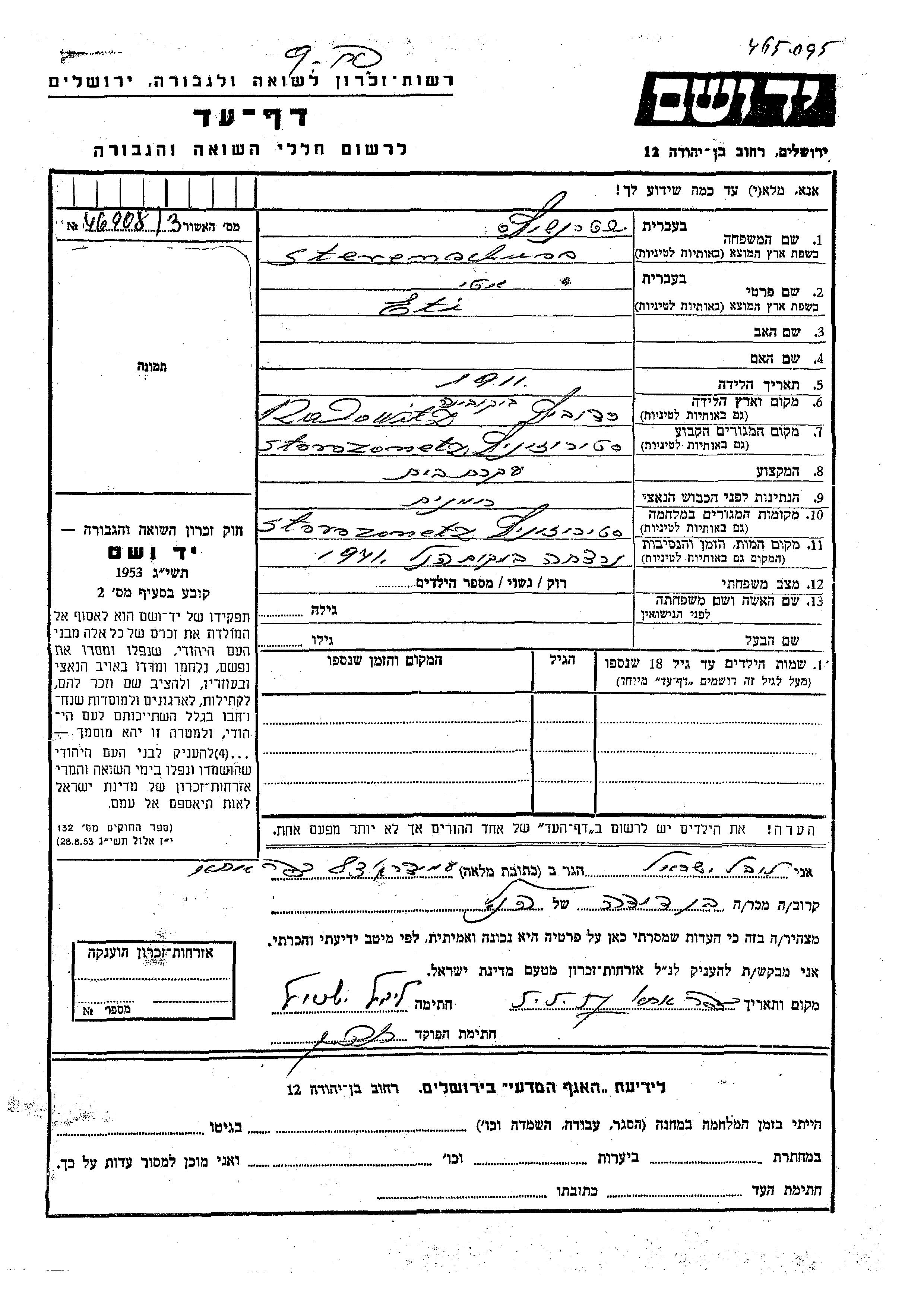 Eti Sterenschuss est née à Radowicze, Pologne en 1911. Elle était Femme au foyer. Avant la seconde guerre mondiale elle vivait à Storozonetz, Roumanie. Pendant la guerre, elle était à Storozonetz, Roumanie.