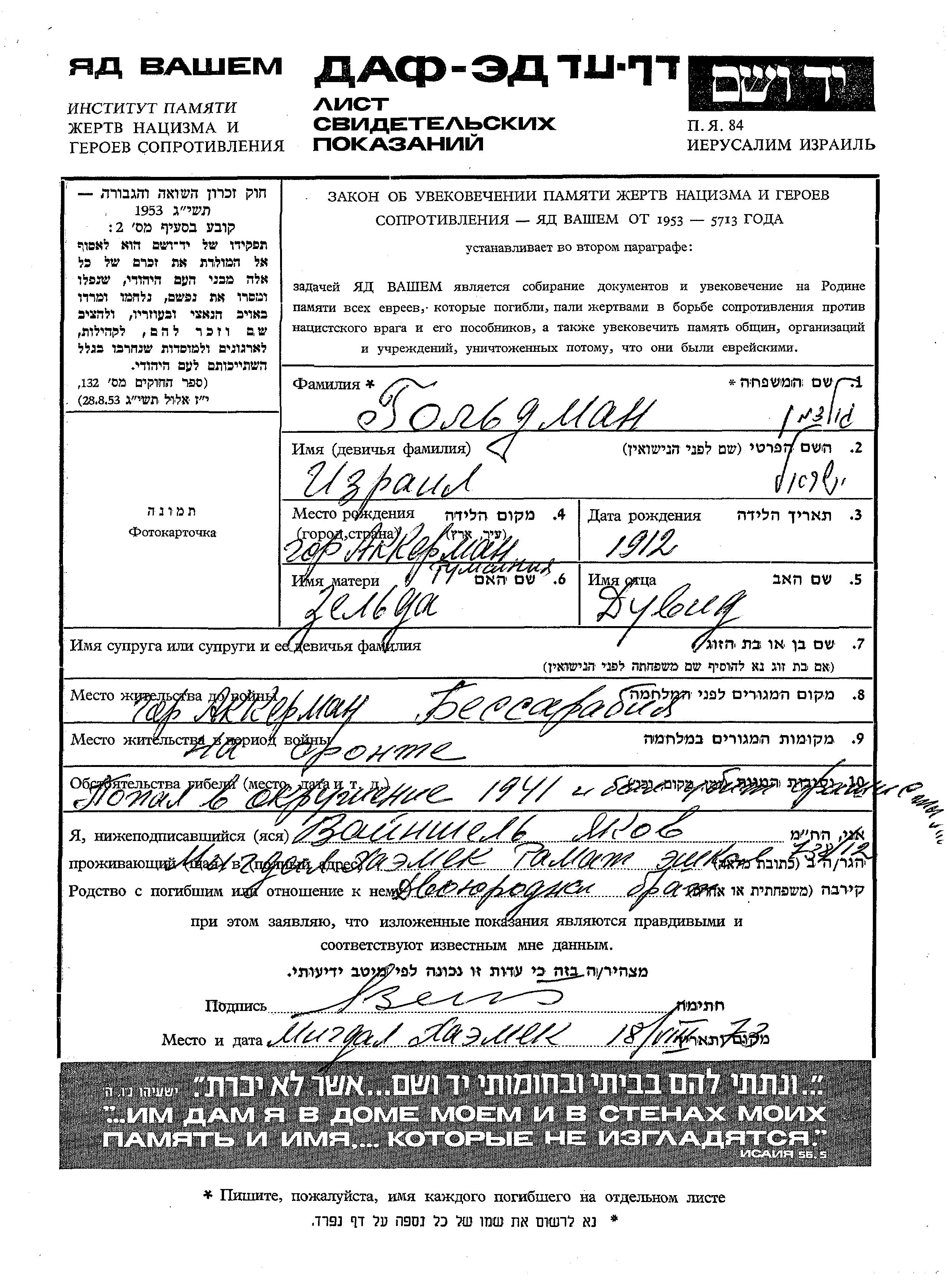 Yad Vashem - Pages of Testimony Names Memorial Collection