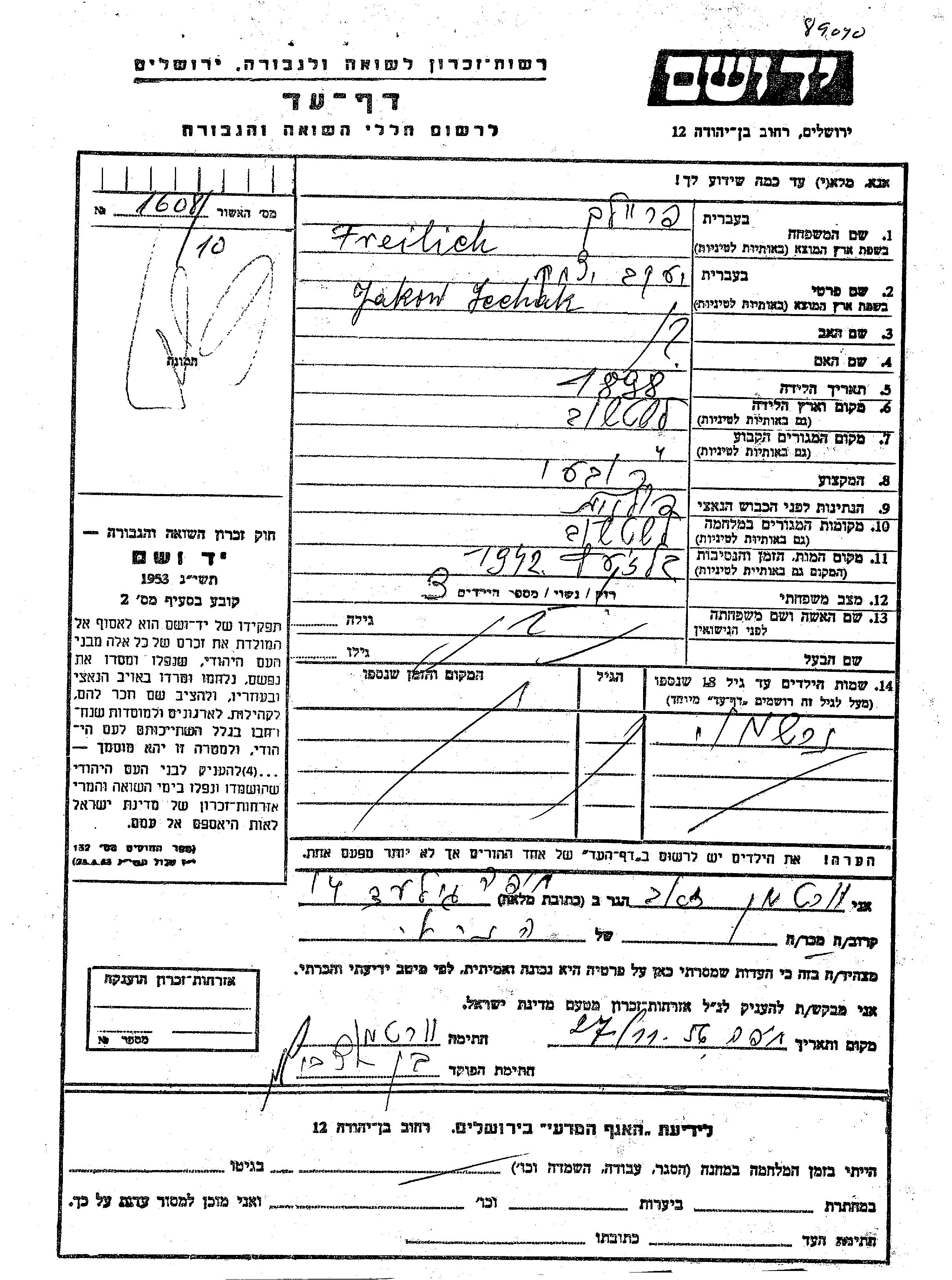 Freilich Jakow Jcchak 1898 Laszczow, Pologne Feuille de témoignage
