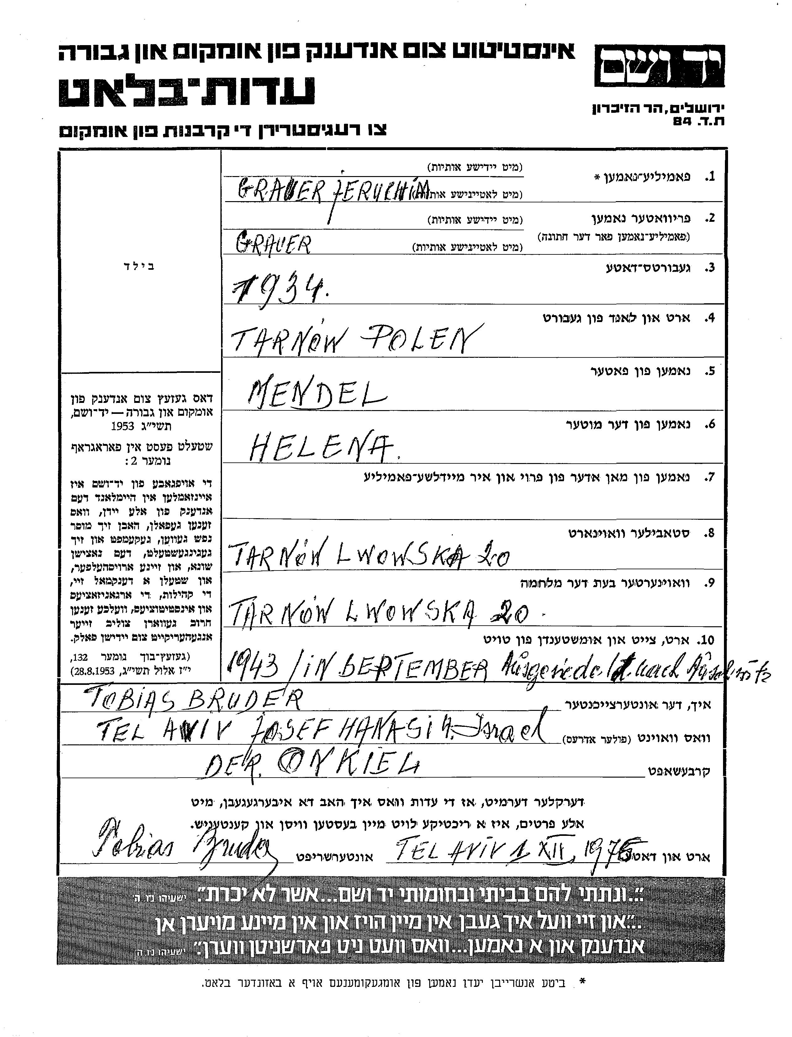 Grauer Jeruchim 1934 Tarnow, Pologne Feuille de témoignage