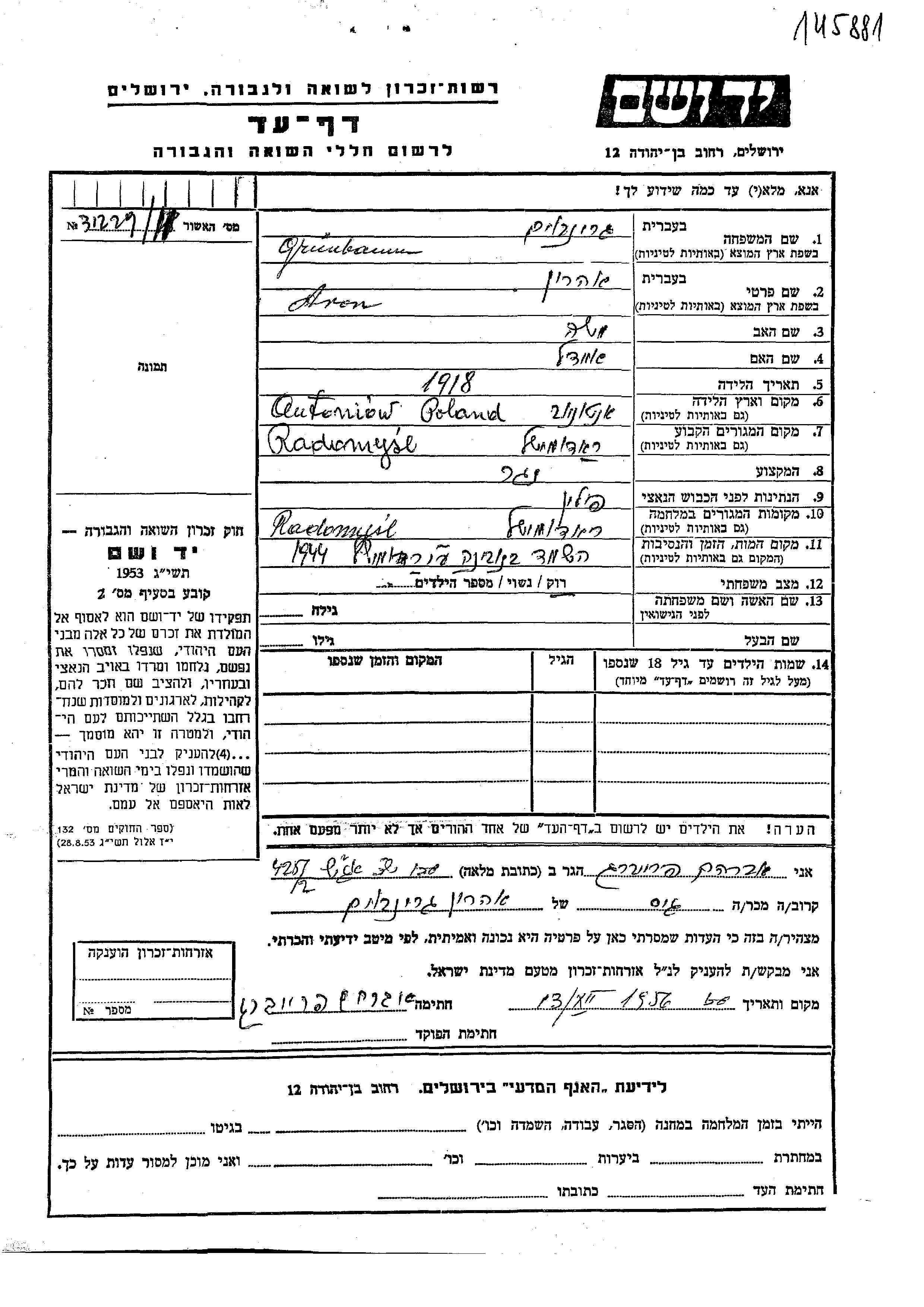 Grinboim Aron 1918 Radomysl nad Sanem, Pologne Feuille de témoignage