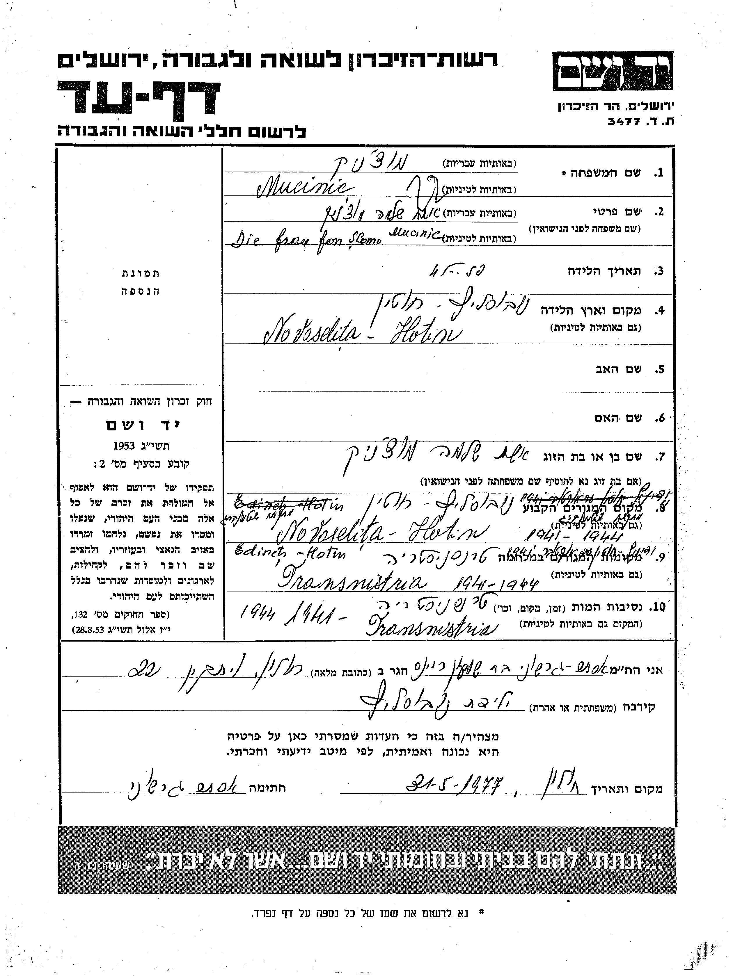 Mucinic prénom inconnu Novoselita, Roumanie Feuille de témoignage
